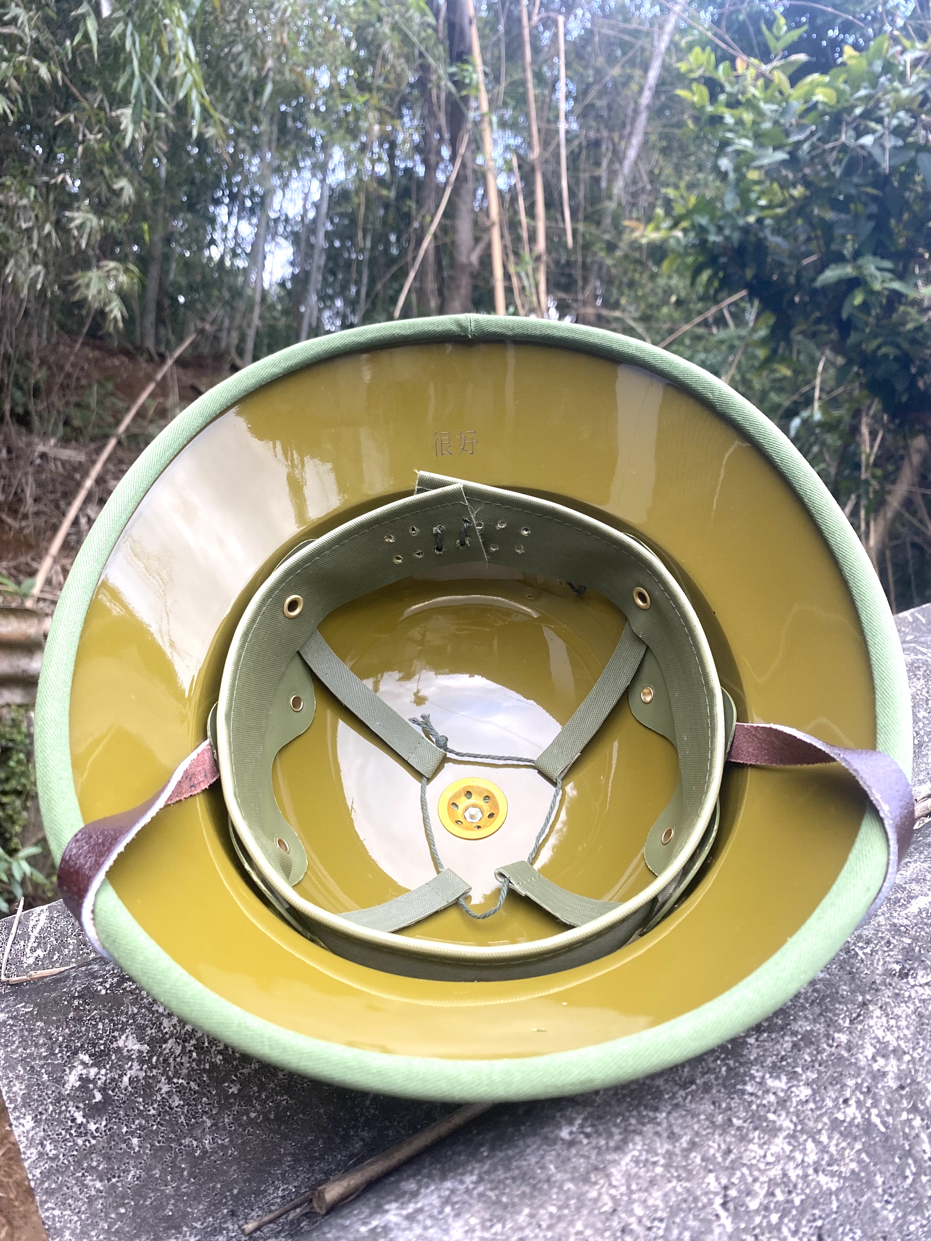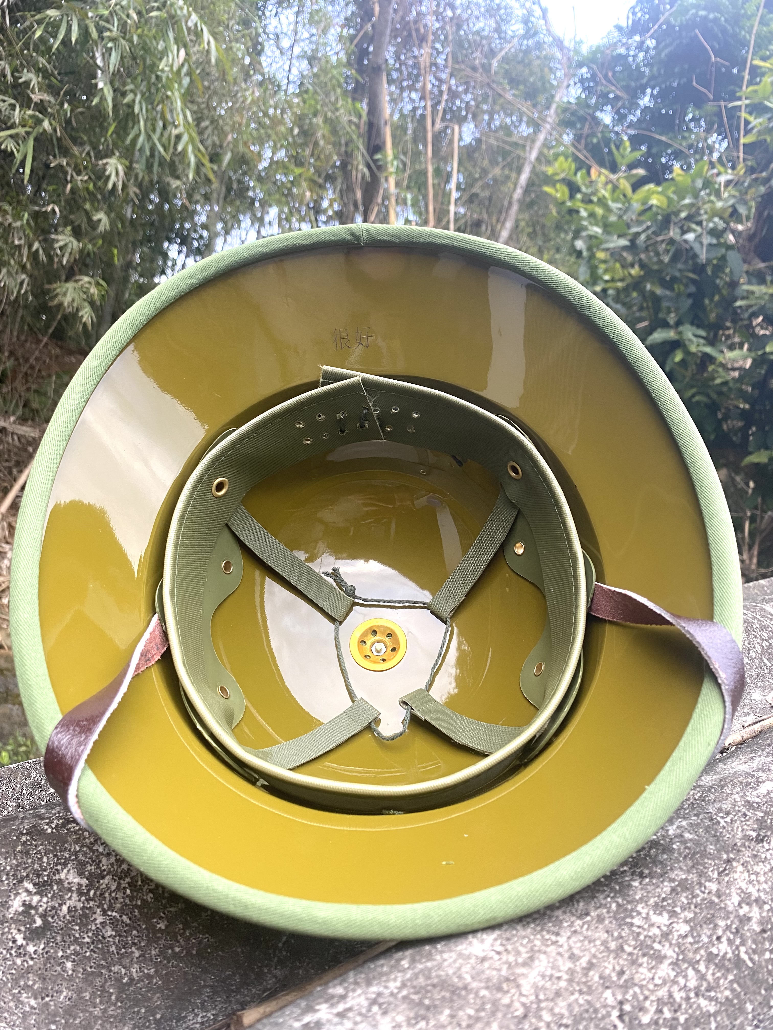 Mũ cối chuẩn 1966 Chịu lực chịu va đập cực tốt chống nước chống phai màu Lòng vàng Bọc Vải chuẩn đẹp Lỗ thông hơi,khuy làm bằng nhôm quai làm bằng da bò Cách điện,