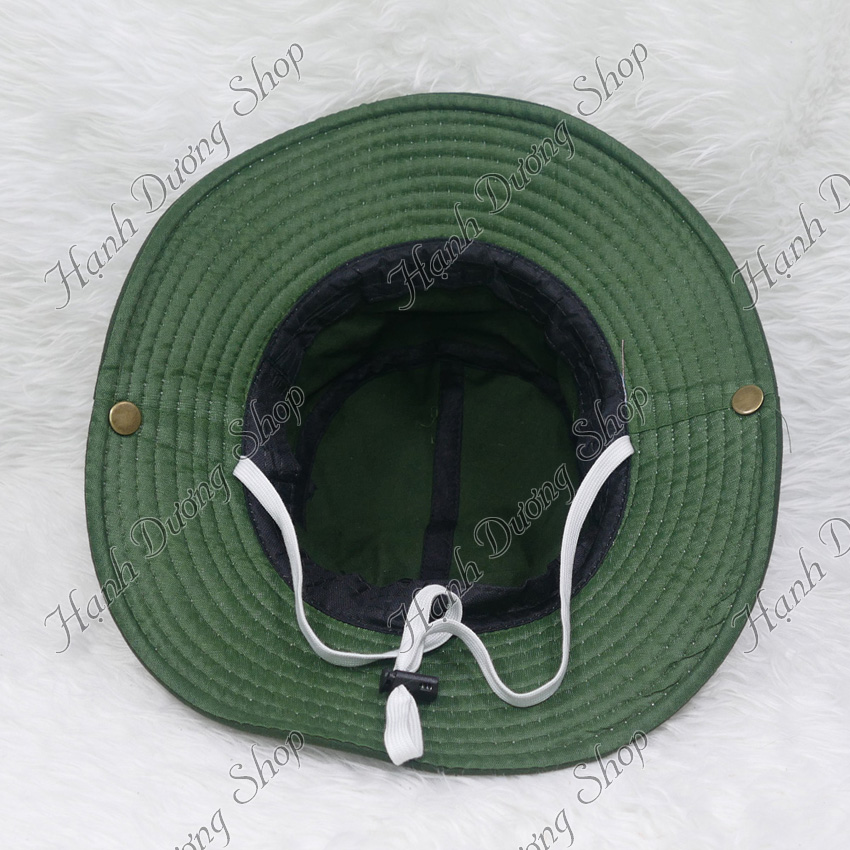 Vải Kaki dày dặn nhưng không nóng vì là 100%cotton. Có dây đeo không lo gió bay. Nút bấm kim loại 2 bên vành nón để bẻ lên cho ngầu luôn. Shop nhận thêu logo
