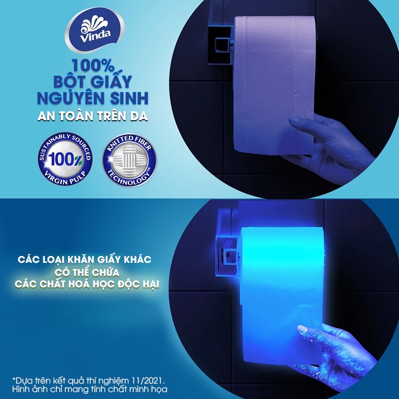 Câu chuyện thương hiệu: Các gia đình Việt Nam đang ngày càng quan tâm sâu sắc hơn về các giải pháp chất lượng và an toàn dành cho toàn bộ mọi người trong gia đình đặc biệt là trẻ nhỏ. Họ mong muốn sản phẩm không chỉ hiệu quả mà còn mang đến chất lượng thoải mái để họ có thể yên tâm về sức khỏe cũng như sự an toàn cho các thành viên trong gia đình. Vinda thấu hiểu sâu sắc và luôn nỗ lực để đáp ứng yêu cầu thích đáng của khách hàng.  Vinda mong muốn trở thành một phần không thể thiếu trong các hoạt động thường nhật của gia đình bạn. Khăn giấy Vinda sẽ mang đến sự hiệu quả cũng giống như sự bền dai vượt trội ngay cả khi ướt thông qua công nghệ Knitted Fiber chuyên biệt, qua đó, để các gia đình luôn cảm giác an tâm và thoải mái trong mọi khoảnh khắc. Giới thiệu sản phẩm: Giấy vệ sinh cao cấp Vinda Deluxe được sản xuất từ 100% bột giấy nguyên sinh, không hóa chất tẩy độc hại, an toàn cho cả làn da nhạy cảm. Giấy vệ sinh có kết cấu bền dai ngay cả khi ướt, không để lại vụn giấy khi sử dụng, giúp bạn luôn cảm thấy dễ chịu và sạch sẽ sau mỗi lần dùng. Sản phẩm có thiết kế với mỗi tờ dài hơn, tiết kiệm và cấu tạo 3 lớp, giấy vệ sinh Deluxe đảm bảo khả năng thấm hút tốt, giúp giữ vệ sinh tối ưu. Hạn sử dụng và quy cách: Hạn sử dụng: 3 năm kể từ ngày sản xuất. Ngày sản xuất: in trên gói theo năm/tháng/ngày Quy cách:  Giấy vệ sinh cao cấp Vinda Deluxe Số lượng: 8 cuộn/ lốc, 250 tờ/ cuộn Số lớp: 3 lớp/ tờ Định lượng của 1 lớp giấy: 16 ± 1,0 gsm Kích thước: (138mm x 104mm) ± 5 mm Thành phần: 100% Bột giấy nguyên thủy. Bảo quản: Để nơi thoáng mát và tránh ánh nắng mặt trời