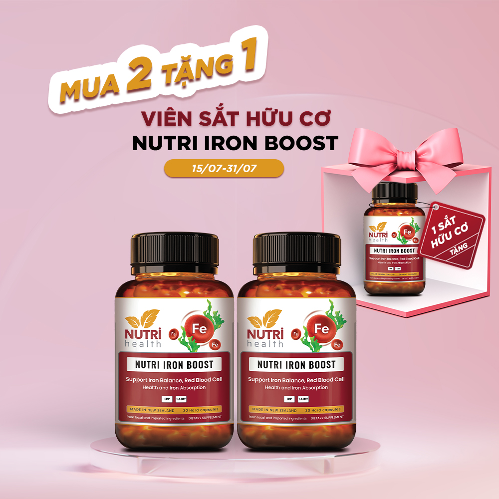 Mua tại TiktokVIÊN SẮT HỮU CƠ NUTRI IRON BOOST (30 VIÊN) Thực phẩm bảo vệ sức khỏe SẮT HỮU CƠ NUTRI IRON BOOST Bổ sung sắt bisglycinate chelate và acid folic cho cơ thể Sản xuất tại New Zealand GIẤY ĐKSP CỦA BỘ Y TẾ: 3523/2023/ĐKSP NUTRI IRON BOOST là sắt hữu cơ thiên nhiên, kết hợp Vitamin C, Acid Filic và Vitamin B12 giúp tạo máu, tăng cường hấp thu sắt vào cơ thể, tạo kháng thể, phòng ngừa thiếu máu đặc biệt là phụ nữ mang thai. VIÊN SẮT HỮU CƠ NUTRI IRON BOOST CÓ GÌ ĐẶC BIỆT: