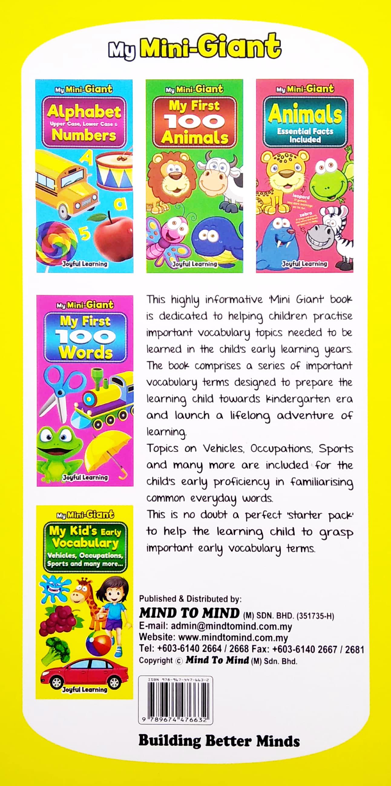 This highly informative 'Mini Giant book is dedicated to helping children practise important vocabulary topics needed to be learned in the child's early learning years. The book comprises a series of important vocabulary terms designed to prepare the learning child towards kindergarten era and launch a lifelong adventure of learning.