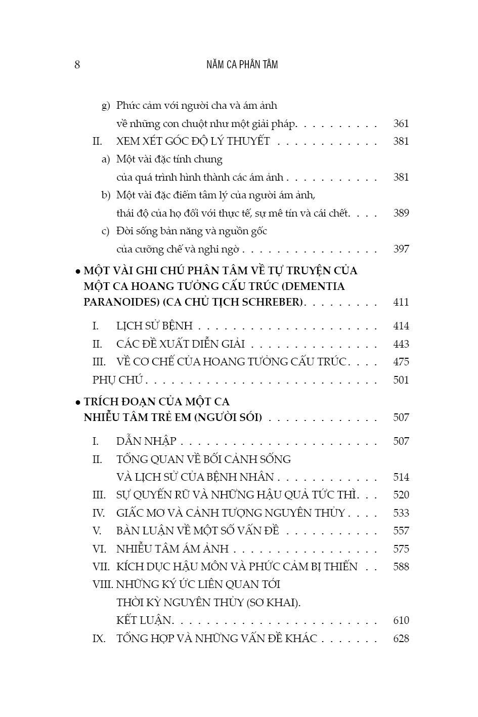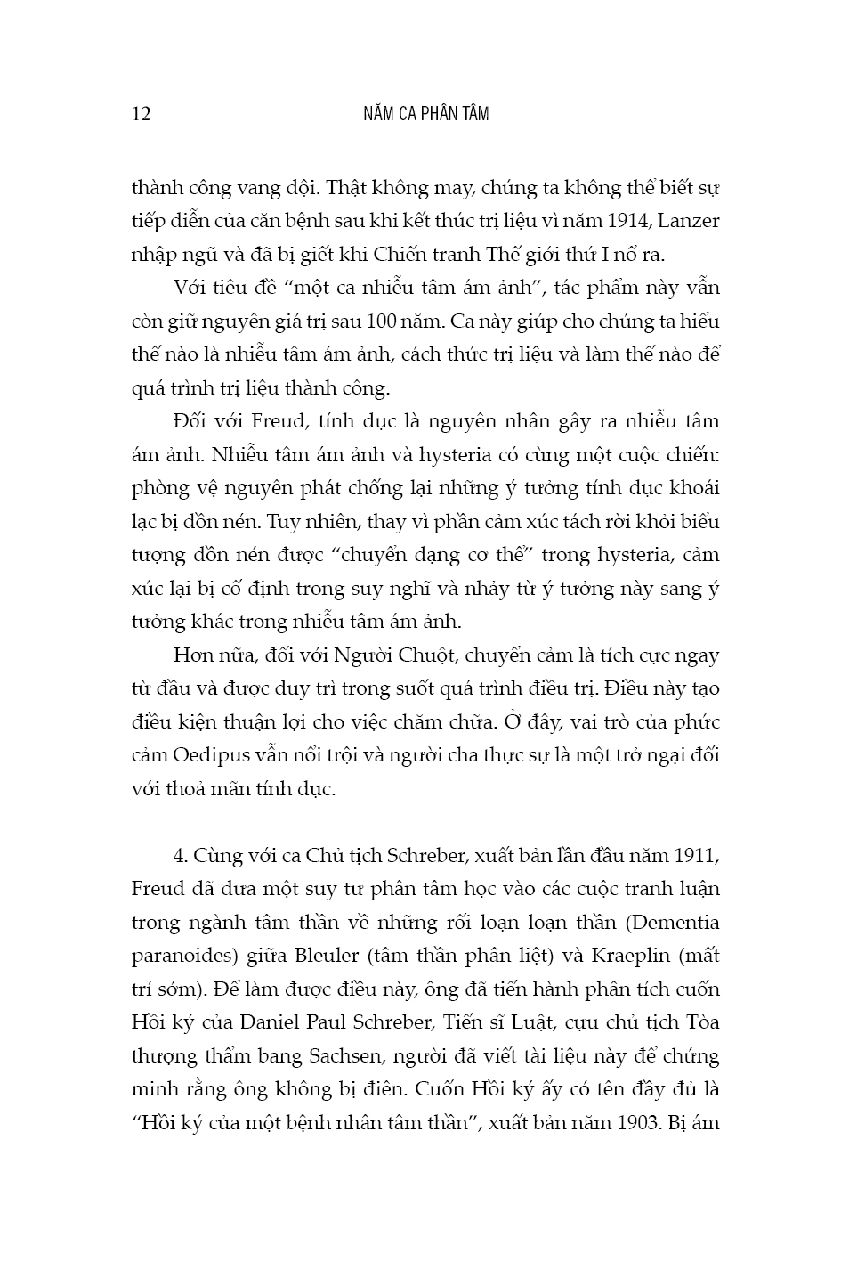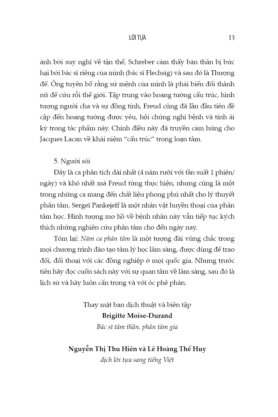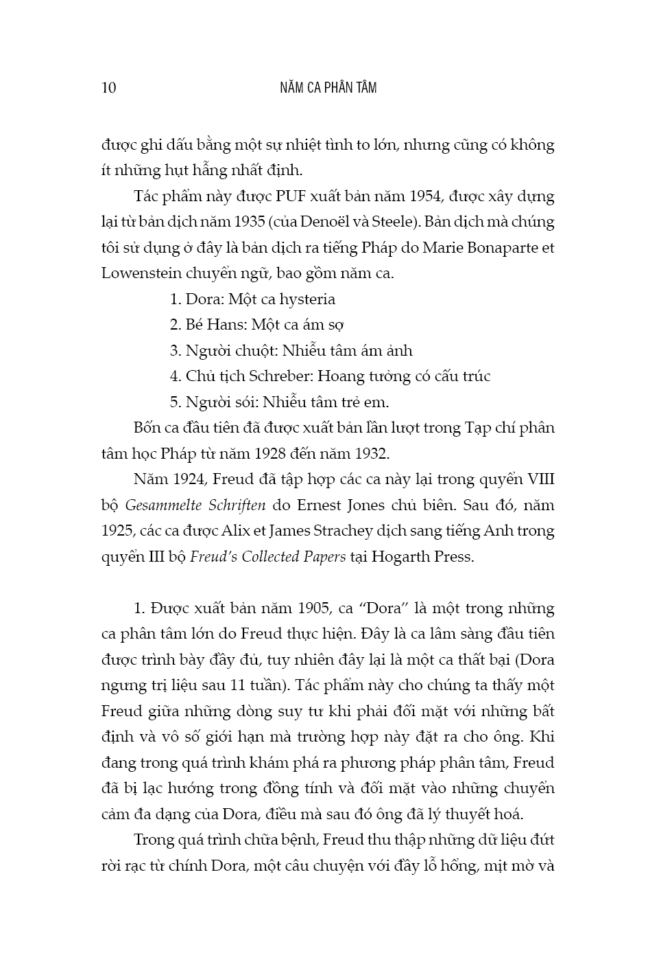 Tóm lại: Năm ca phân tâm là một tượng đài vững chắc trong mọi chương trình đào tạo tâm lý học lâm sàng, được dùng để trao đổi, đối thoại với các đồng nghiệp ở mọi quốc gia. Nhưng trước tiên hãy đọc cuốn sách này với sự quan tâm về lâm sàng, sau đó là lịch sử và hãy luôn cẩn trọng và với óc phê phán.