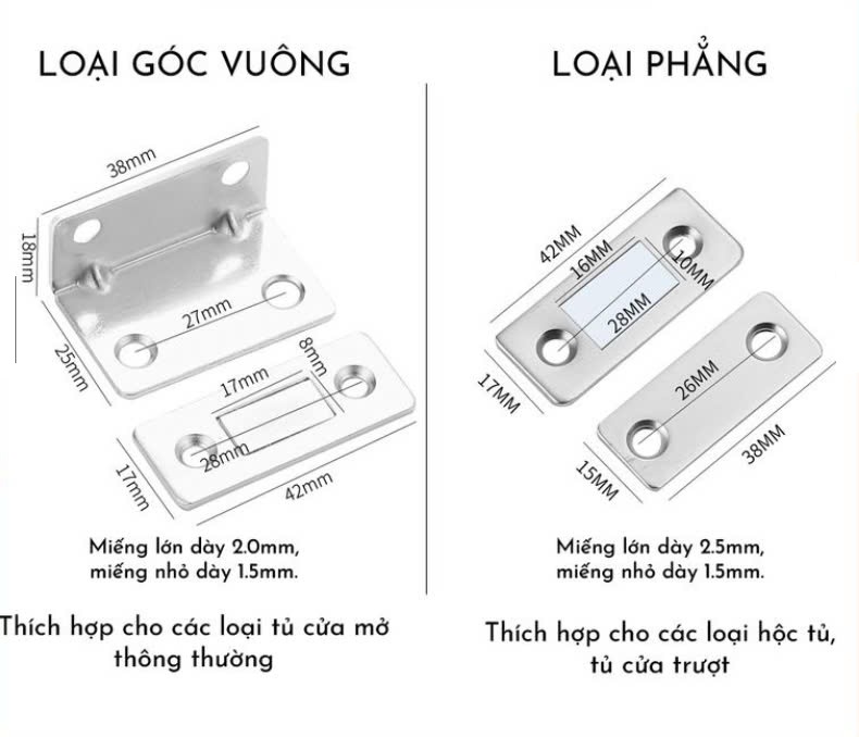 Loại góc vuông: dùng cho các loại cửa tủ thông thường. Kích thước: 18x38x35mm.