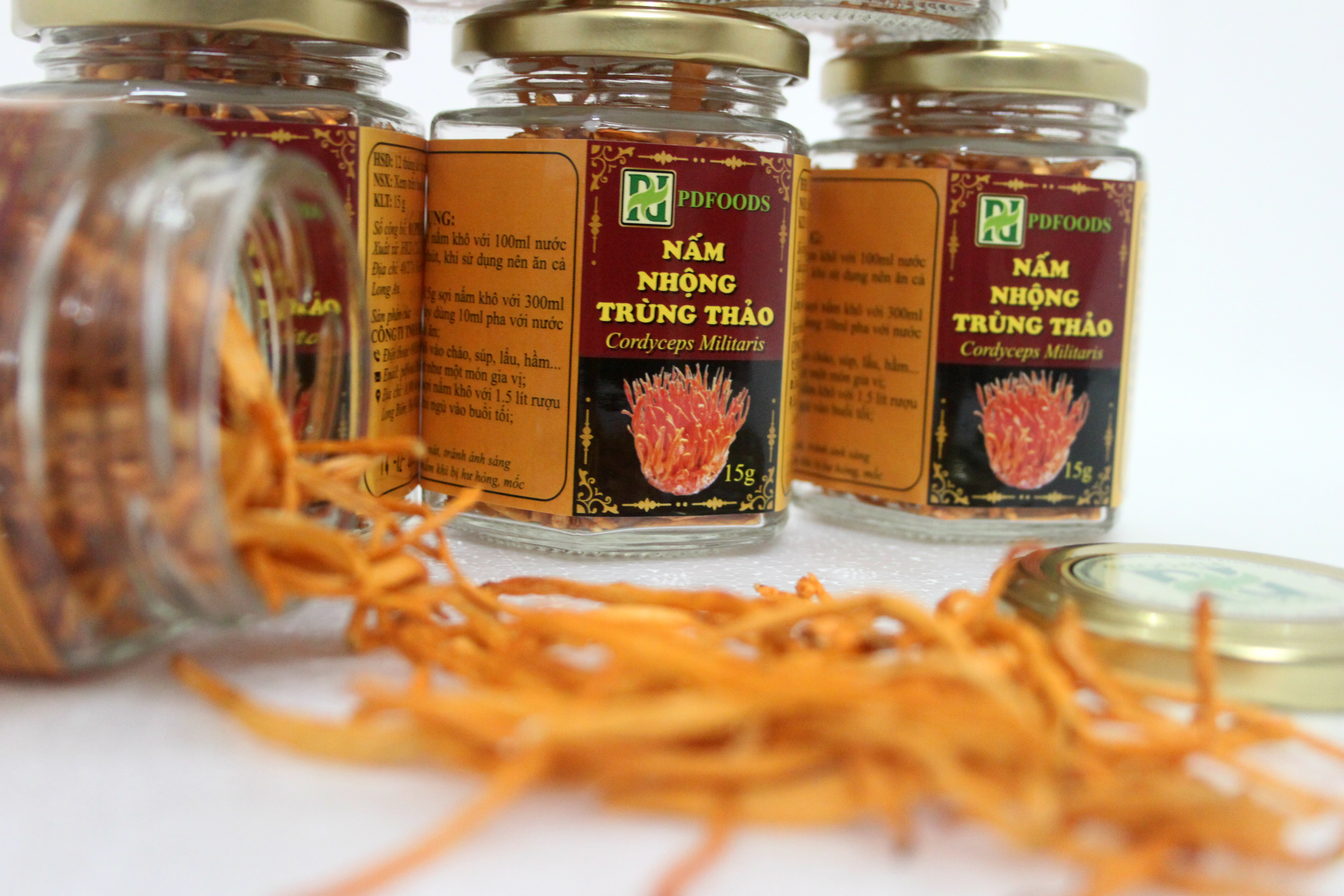 Sản phẩm nấm nhộng trùng thảo PDFoods được nuôi trồng hữu cơ. Thông tin cơ bản của sản phẩm: - Tên sản phẩm: Nấm nhộng trùng thảo Cordyceps militaris - Hình thức sản phẩm: sấy