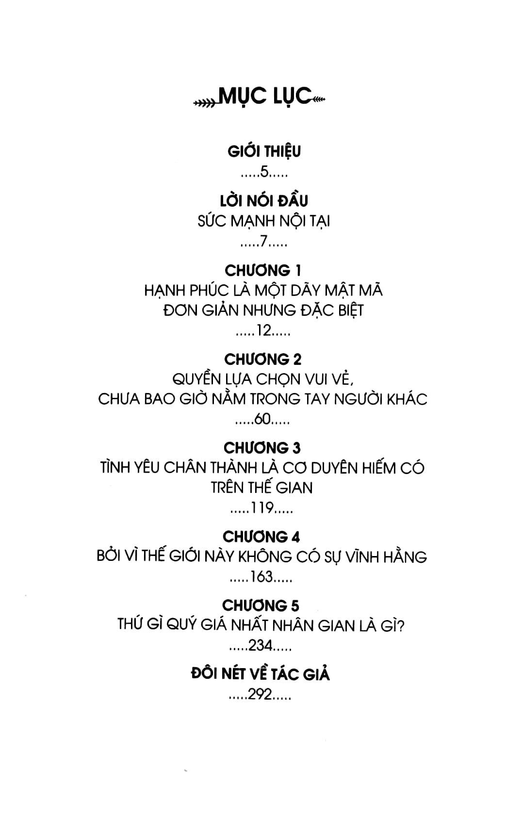 Với hơn 80 câu chuyện với 5 chương chính: Hạnh phúc là một dãy mật mã đơn giản nhưng đặc biệt; Quyền lựa chọn vui vẻ, chưa bao giờ nằm trong tay người khác; Tình yêu chân thành là cơ duyên hiếm có trên thế gian; Bởi thế giới này không có sự vĩnh hằng; Thứ quý giá nhất trên thế gian là gì?