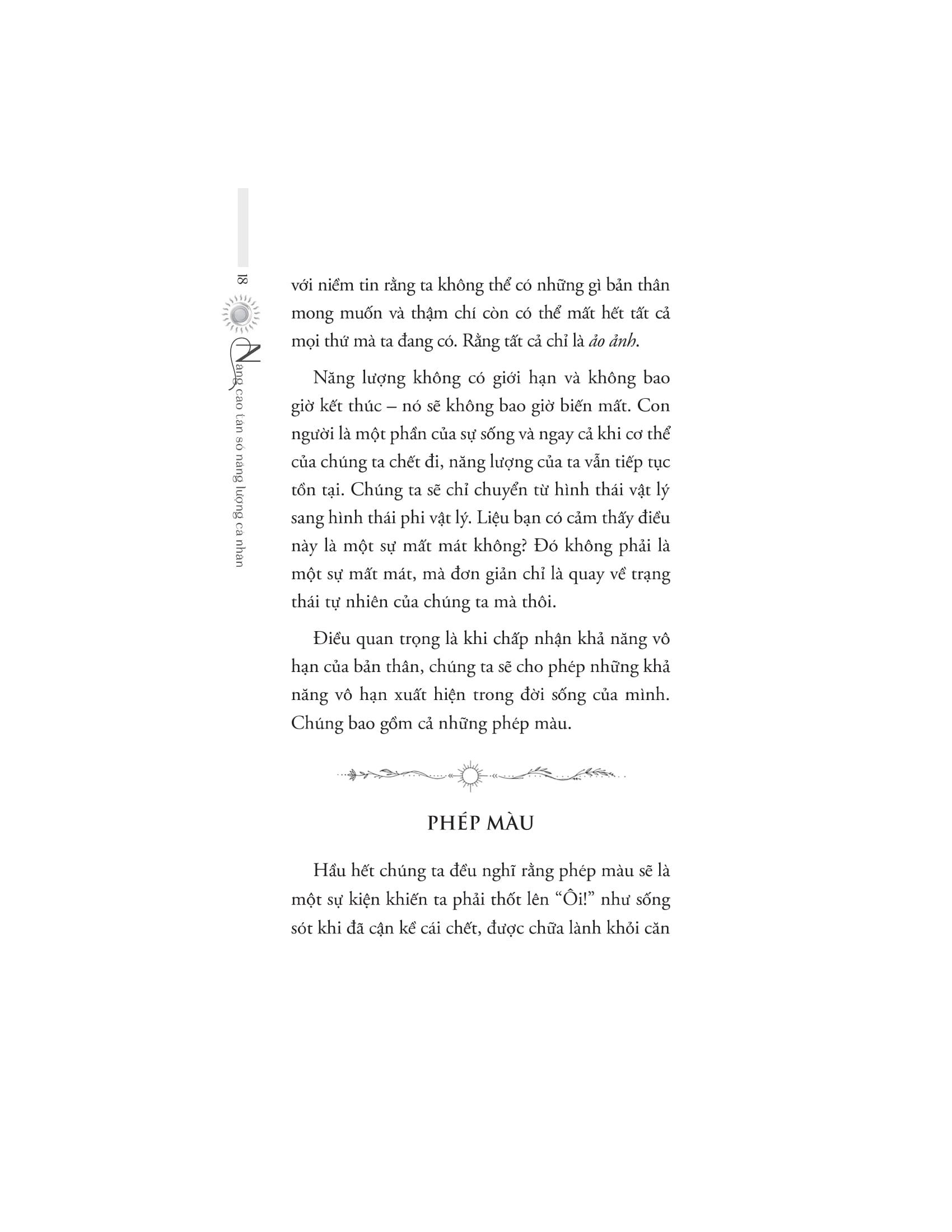 Nâng cao tần số năng lượng cá nhân là một cuốn sách không thể thiếu trên hành trình nâng cao tần số năng lượng này. Bằng các phương pháp như thiền, sử dụng chú ngữ, sống với mục đích và thái độ đúng đắn,... chúng ta sẽ nâng cao được tần số của bản thân. Cuốn sách mang tới 77 bài tập thực hành chi tiết, vô cùng dễ hiểu, dễ thực hành để bất kỳ ai cũng có thể đạt được mục tiêu này.