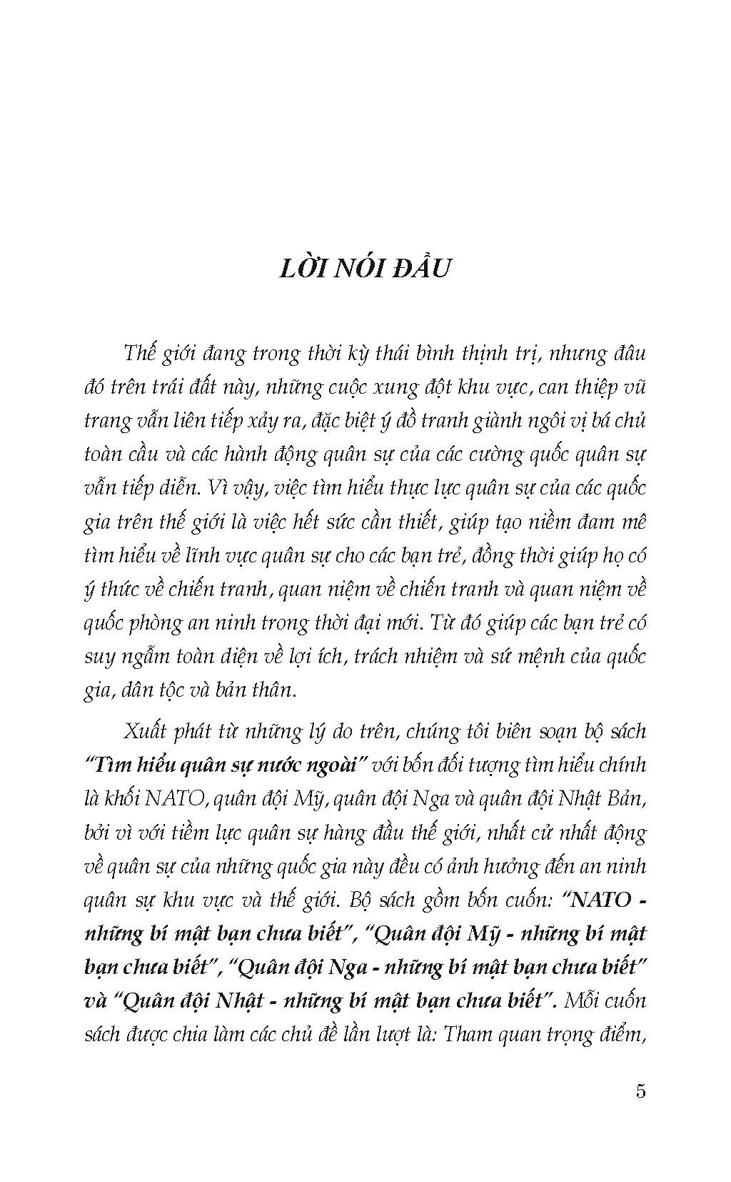 Bộ sách gồm bốn cuốn: “Quân đội Mỹ - những bí mật bạn chưa biết”, “NATO - những bí mật bạn chưa biết”, “Quân đội Nga - những bí mật bạn chưa biết” và “Quân đội Nhật - những bí mật bạn chưa biết”.