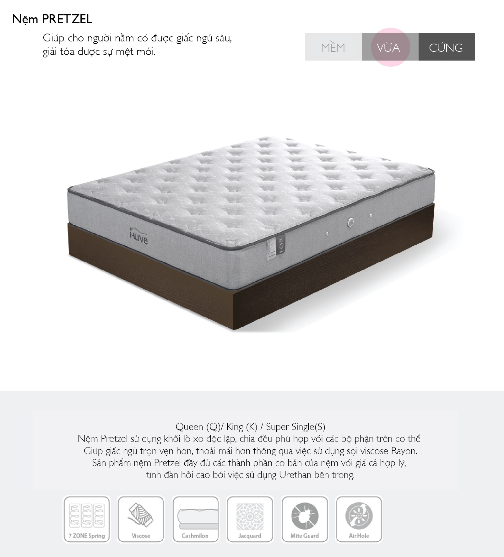 Nệm HUVE - PRETZEL 1.8m nhập khẩu Hàn Quốc THÔNG TIN SẢN PHẨM - Thương hiệu: JANG IN - Xuất xứ: Hàn Quốc - Bộ sưu tập: PRETZEL - Kích cỡ: 1800 x 2000 x