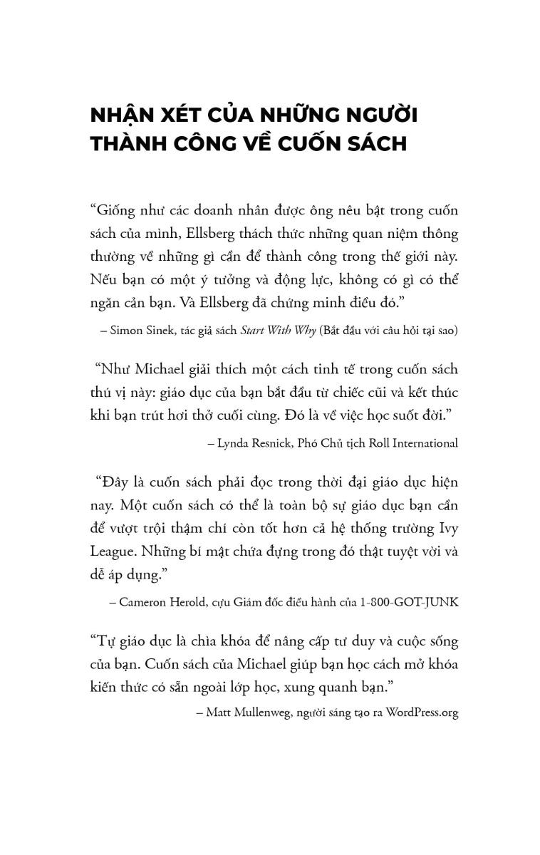 ‘’Trong xã hội ngày nay, thành công của bạn phụ thuộc vào các kỹ năng mềm và ứng dụng trong cuộc sống nhưng những điều này không được dạy trong chương trình đào tạo ở trường học. Cuốn sách mang tính đột phá của Ellsberg cung cấp cho bạn những bài học thực tế để bạn lấp đầy những lỗ hổng giáo dục đó” (Keith Ferrazzi, tác giả cuốn sách nổi tiếng Ai che lưng cho bạn). Cho dù bạn đã từng bỏ học, chưa có bằng đại học, hay bạn đã tốt nghiệp trường đại học danh tiếng như Harvard thì Nền giáo dục của người giàu cũng giúp bạn thành công trong cuộc sống. Cuốn sách được xem là ‘’Giáo trình cho một cuộc sống thành công.’’