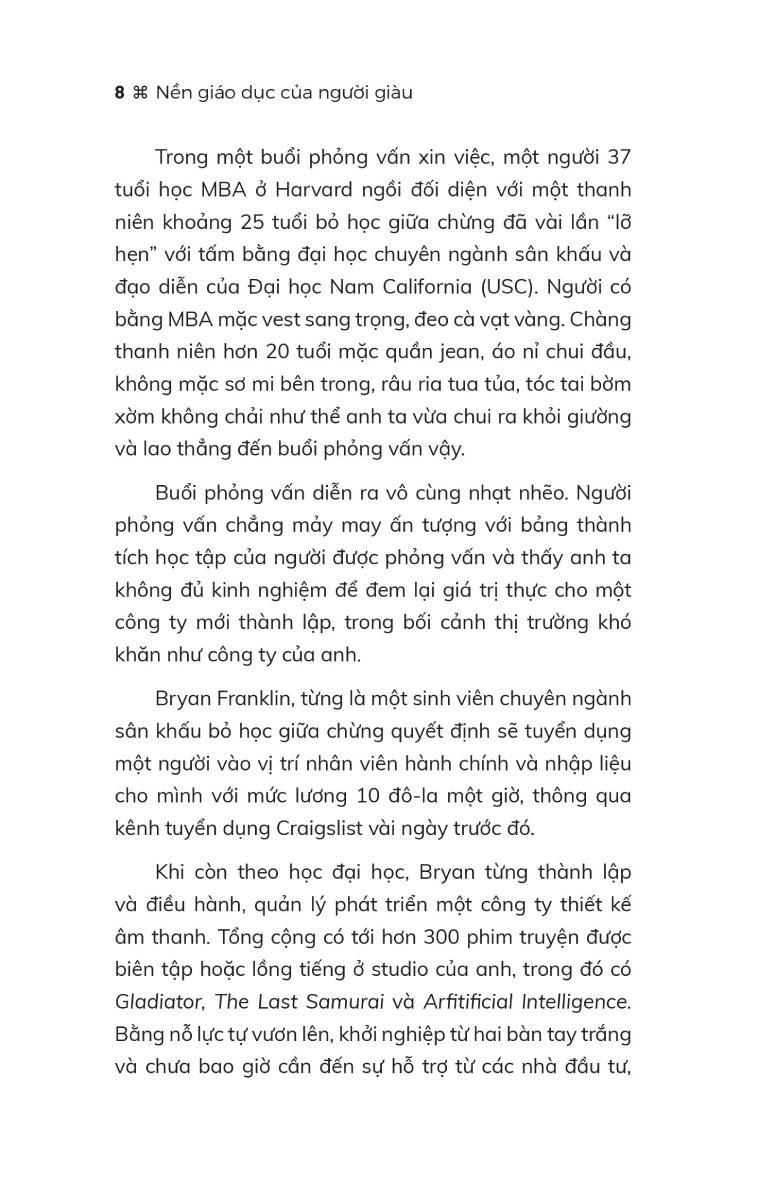 Bạn sẽ thấy được điều đó khi đọc Nền giáo dục của người giàu của Michael Ellsberg. Tác giả đã phỏng vấn các tỉ phú và triệu phú không có bằng đại học, bao gồm ông trùm thời trang Russell Simmons, chủ tịch đồng sáng lập ok Sean P Bên cạnh đó, Michael Ellsberg còn đưa ra những chỉ dẫn tuyệt vời để bạn tiến tới thành công bằng những kỹ năng vô cùng đơn giản: Để tìm được người hướng dẫn, cách tạo hứng thú trong công việc, cách xây dựng phong cách cá nhân và nhiều hơn thế nữa.