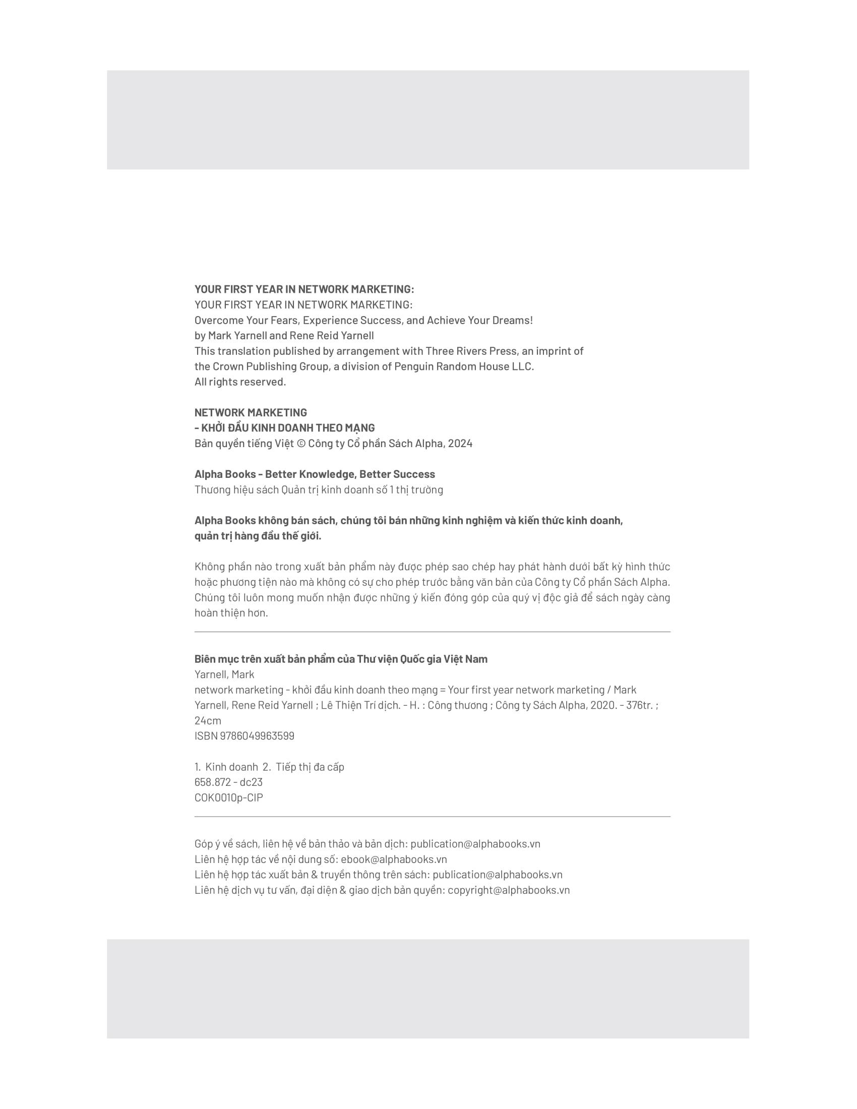 "Network Marketing - Khởi Đầu Kinh Doanh Theo Mạng: Bí Quyết Thành Công Trong Năm Đầu Tiên" tập trung vào việc giúp những người mới bắt đầu tham gia ngành kinh doanh theo mạng lưới vượt qua những khó khăn ban đầu. Cuốn sách cung cấp các chiến lược thực tiễn, lời khuyên cụ thể, và những câu chuyện thành công nhằm giúp người đọc xây dựng được nền tảng vững chắc cho sự nghiệp của m.ình.