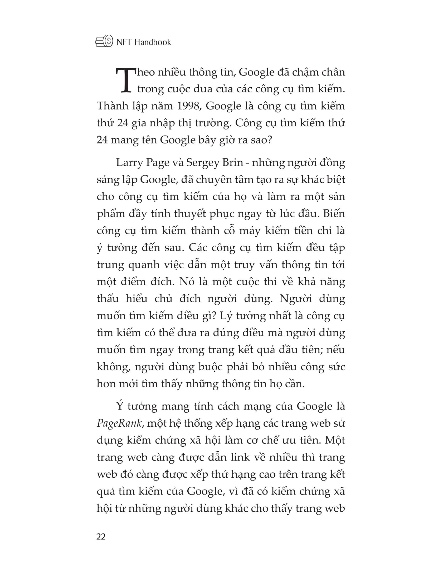 Cuốn sách giới thiệu các loại NFT khác nhau và từng mục chi tiết có trong một NFT. Bên cạnh đó, ta cũng sẽ được biết về các sàn giao dịch NFT phổ biến nhất hiện nay, ưu và nhược điểm của từng sàn. Độc giả có thể thử sức với việc tự tạo ra NFT của riêng mình và đưa các tác phẩm vào blockchain Ethereum, thử đấu giá nó trên sàn giao dịch và tạo ra một nguồn thu nhập mới.