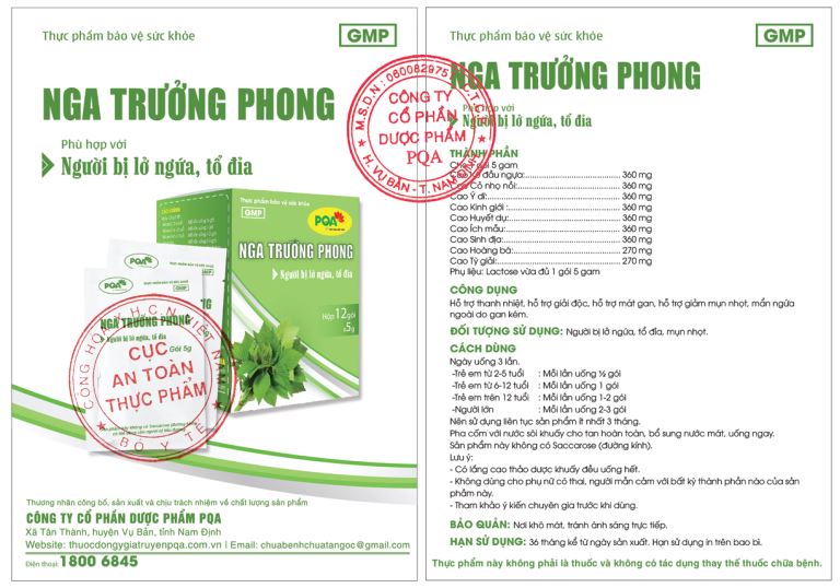 Nga Trưởng Phong PQA Hỗ Trợ Thanh Nhiệt Giải Độc, Giảm Mụn Nhọt Và Mẩn Ngứa Ngoài Da Hộp 12 Gói THÔNG TIN SẢN PHẨM: - Xuất xứ: Việt Nam - Dung tích: Hộp 12