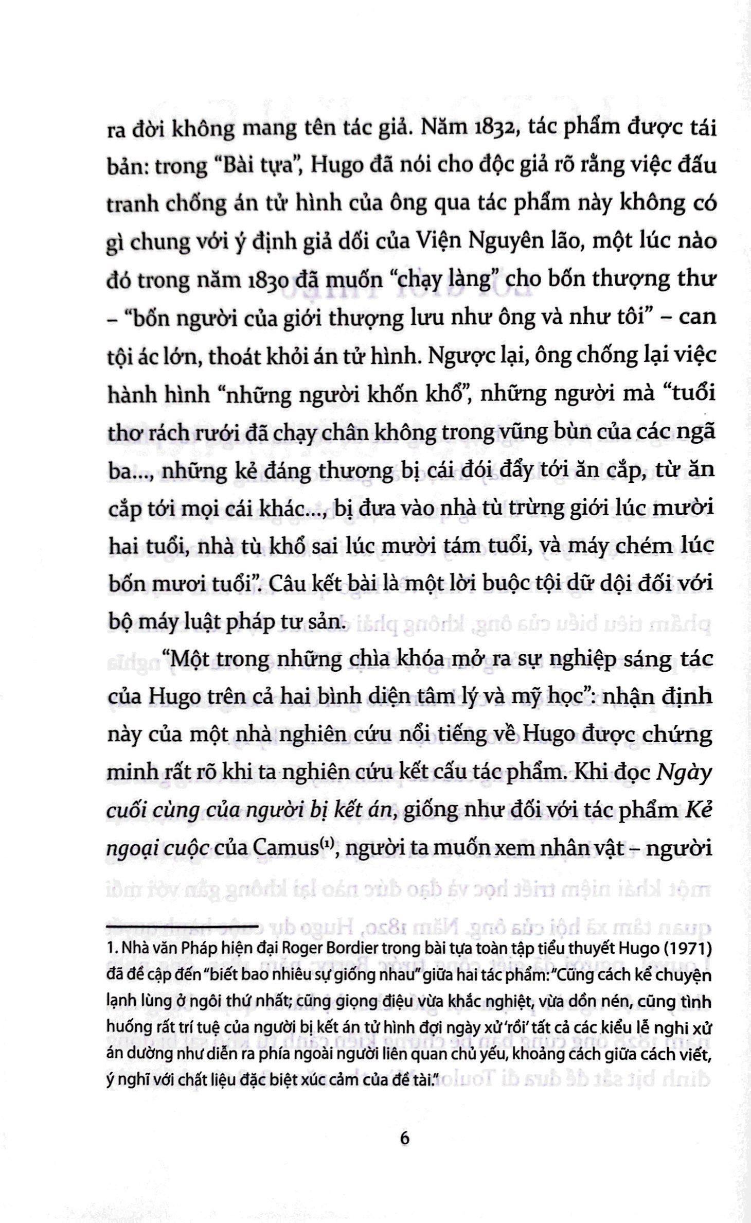 Và trật tự sẽ không biến mất cùng với đao phủ; các vị hãy đừng tin là thế. Nóc vòm của xã hội tương lai sẽ không vì thiếu đi viên đá đỉnh vòm gớm ghiếc ấy mà sụp đổ. Văn minh không gì khác chính là một loạt những biến chuyển liên tiếp. Luật pháp dịu dàng của Đấng Kitô cuối cùng sẽ đi vào bộ luật và xuyên chiếu sáng ngời. Người ta sẽ xem tội ác như một căn bệnh, và căn bệnh này sẽ có những thầy thuốc riêng của nó thay cho những thẩm phán của các vị, những bệnh viện thay cho những nhà tù khổ sai của các vị. Tự do và sức khỏe sẽ như nhau. Người ta sẽ rót nhựa thơm và dầu trị bệnh vào nơi mà người ta từng dùng đến sắt và lửa. Người ta sẽ lấy từ tâm để đối đãi với cái ác mà người ta vốn từng đối xử bằng giận dữ. Thật đơn giản và cao thượng. Thánh giá thay cho giá treo cổ. Vậy thôi.”