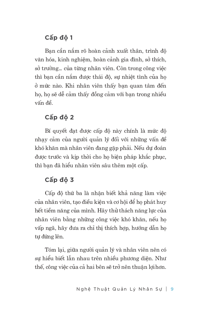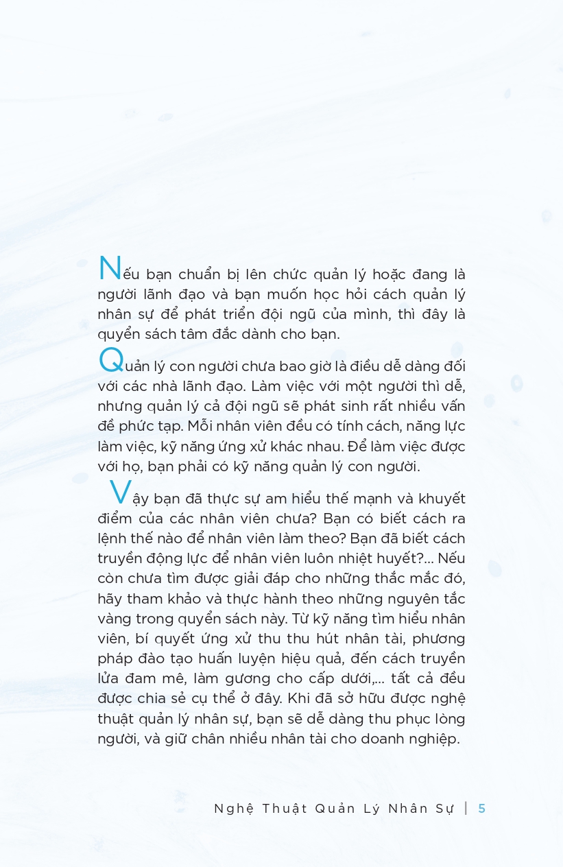 Nghệ Thuật Quản Lý Nhân Sự trình bày dễ hiểu những điểm quan yếu nhất trong phương pháp quản lý nhân sự: cách ra lệnh, chọn giải pháp, giải quyết trở ngại, đề xuất thưởng phạt, khích lệ nhân viên... kèm theo những ví dụ cụ thể thường xảy ra trong thực tế. Vận dụng tinh tế, đúng lúc những phương pháp này, bạn sẽ nắm được bí quyết quản lý, dễ dàng tạo dựng thành công cho cá nhân lẫn doanh nghiệp.