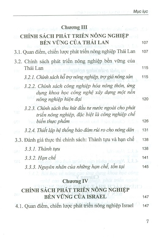 Trước thực tế nêu trên, tháng 4/2018, Nhà xuất bản Khoa học xã hội đã phát hành ấn phẩm "Nghiên cứu so sánh chính sách nông nghiệp ở Trung Quốc, Thái Lan, Israel và bài học kinh nghiệm cho Việt Nam" do PGS.TS. Phạm Thị Thanh Bình (Chủ biên). Nội dung cuốn sách đề cập đến nhiều khía cạnh, vấn đề nổi lên trong quá trình phát triển nông nghiệp bền vững của các quốc gia nêu trên. Ngoài phần Mở đầu, kết luận, cuốn sách được cấu trúc thành 5 chương như sau: Chương 1: Cơ sở lý luận và thực tiễn về phát triển nông nghiệp bền vững; Chương 2: Chính sách phát triển nông nghiệp bền vững của Trung Quốc; Chương 3: Chính sách phát triển nông nghiệp bền vững của Thái Lan; Chương 4: Chính sách phát triển nông nghiệp bền vững của Israel; Chương 5: Chính sách phát triển nông nghiệp bền vững của Việt Nam.