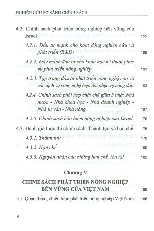 Chương 4 luận bàn về chính sách phát triển nông nghiệp bền vững của Israel. Dựa trên các nghiên cứu về quan điểm, chiến lược và chính sách nông nghiệp bền vững của Israel trên các chiều cạnh: đầu tư cho hoạt động nghiên cứu và phát triển (R&D); đầu tư cho khoa học kĩ thuật phục vụ phát triển nông nghiệp; đầu tư phát triển công nghệ cao và các dịch vụ công nghệ hiện đại phục vụ nông dân; chính sách phối hợp chặt chẽ giữa: nhà nước - nhà khoa học - nhà doanh nghiệp - nhà tư vấn và nhà nông; hoạt động bảo hiểm nông nghiệp. Các nhà khoa học cũng chỉ ra được các thành tựu, hạn chế cũng như nguyên nhân của những hạn chế, tồn tại trong nông nghiệp của Israel là do công nghệ nông nghiệp phát triển ngày càng hiện đại, sản lượng nông nghiệp tăng đã dẫn đến sự sụt giảm số lượng lao động nông nghiệp; do điều kiện tự nhiên của Israel vô cùng khắc nghiệt, không thuận lợi cho canh tác nông nghiệp; do nông nghiệp Israel không tránh khỏi việc sử dụng thuốc bảo vệ thực vật. Mặc dù vậy, đây vẫn là quốc gia có chính sách nông nghiệp đồng bộ; Sự hợp tác mật thiết và liên tục giữa các nhà nghiên cứu và nhà nông cùng các ngành dịch vụ và công nghiệp liên quan tới nông nghiệp đã giúp cho năng suất lao động nông nghiệp tăng cao. Hoạt động nghiên cứu và phát triển theo hướng ứng dụng đã được tiến hành ở Israel từ rất sớm, giúp ngành nông nghiệp phát triển dựa vào khoa học và công nghệ và trở thành quốc gia có nên nông nghiệp phát triển nhất thế giới.