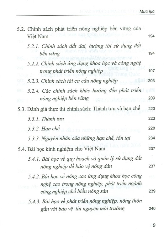 Chương 5 tập trung luận bàn về chính sách phát triển nông nghiệp bền vững của Việt Nam. Qua việc phân tích các quan điểm, chiến lược, chính sách phát triển nông nghiệp bền vững của Việt Nam trên các chiều cạnh: Chính sách đất đai, hướng tới sử dụng bền vững; Chính sách ứng dụng khoa học kĩ thuật và công nghệ trong phát triển nông nghiệp; Chính sách tái cơ cấu nông nghiệp; Chính sách khác hướng tới phát triển nông nghiệp bền vững. Các nhà khoa học đã có nhiều đánh giá tổng quan về thành tựu, hạn chế cũng như các nguyên nhân còn tồn tại dẫn tới các hạn chế trong phát triển nông nghiệp bền vững tại Việt Nam đó là: (1). Hệ thống, cơ chế chính sách phát triển nông nghiệp thiếu tính rõ ràng, đột phá; (2). Môi trường kinh doanh nông nghiệp quá thấp; (3). Đầu tư từ ngân sách nhà nước và các thành phần kinh tế vào nông nghiệp, nông dân, nông thôn còn thấp, chưa đáp ứng được nhu cầu phát triển. Qua đó, các tác giả đã rút ra một số bài học kinh nghiệp cho phát triển nông nghiệp Việt Nam, tập trung vào bài học về quy hoạch và quản lý sử dụng đất nông nghiệp để bảo vệ nông dân; bài học về nâng cao ứng dụng khoa học công nghệ trong nông nghiệp, phát triển ngành công nghiệp chế biến nông sản; bài học về phát triển nông nghiệp, nông thôn gắn với bảo vệ tài nguyên môi trường; bài học về hỗ trợ tài chính có hiệu quả cho nông nghiệp và nâng cao mức sống của cư dân nông thôn; bài học về tạo điều kiện thuận lợi thu hút đầu tư nước ngoài (FDI) vào phát triển nông nghiệp. Đồng thời, các tác giả cũng gợi ý các giải pháp để phát triển nông nghiệp hướng tới việc đổi mới mô hình tăng trưởng, tiếp tục cái cơ cấu nông nghiệp theo hướng nâng cao giá trị gia tăng phát triển bền vững gắn với xây dựng nông thôn mới; Thực hiện quy hoạch nông nghiệp theo hướng dựa vào thị trường mở, để bảo tồn diện tích nông nghiệp; Đẩy mạnh sản xuất lương thực, thực phẩm ở các vùng sâu, vùng xa; Nâng cao năng lực quản lý và ứng phó rủi ro liên quan đến thời tiết và giảm thiểu tác động của biến đổi khí hậu cũng như các rủi ro về thị trường; Tăng cường đầu tư công vào các công trình phòng chống thiên tai, giảm tác động bất lợi về môi trường…