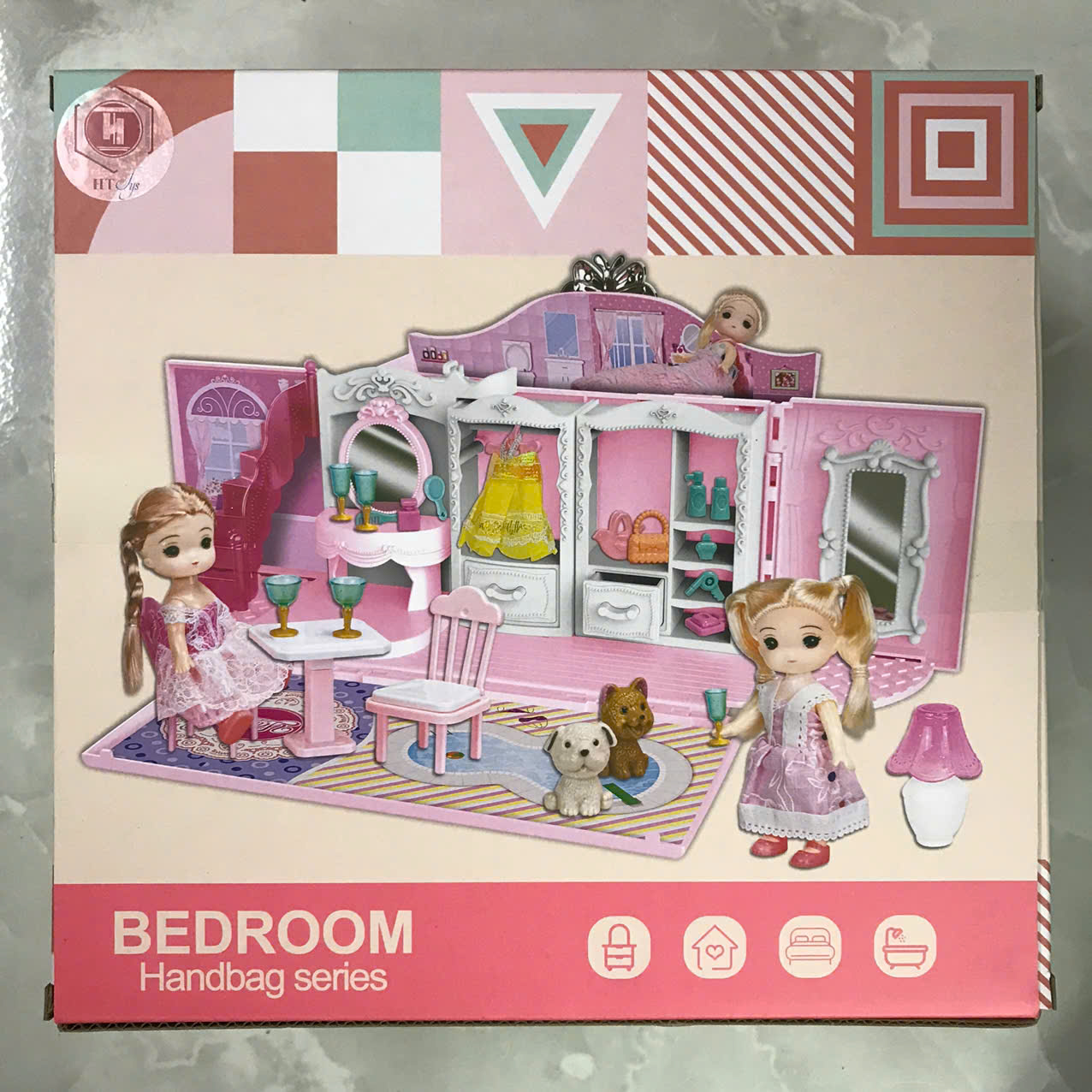 - Túi xách nội thất nhà búp bê màu hồng có đầy đủ các chi tiết: phòng khách, phòng tắm, nhà bếp, bàn ghế, các vật dụng thường ngày trong nhà, chú chó đáng yêu, kẹp tóc... và bé búp bê hồng xinh xắn.