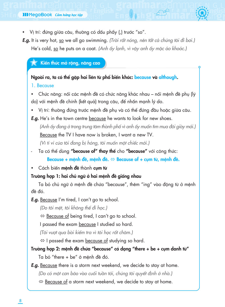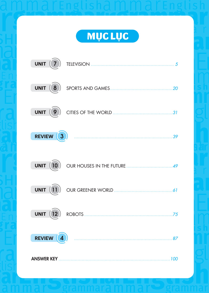 - Tổng hợp đầy đủ, rõ ràng kiến thức ngữ pháp bám sát theo chương trình học - Nội dung kiến thức bám sát theo chương trình học của Bộ giáo dục và Đào tạo, giúp các em nắm vững toàn bộ kiến thức đã học trên lớp, đồng thời làm quen với những nội dung kiến thức mới, mửo rộng và nâng cao, hỗ trợ quá trình tự học tiếng anh hiệu quả.