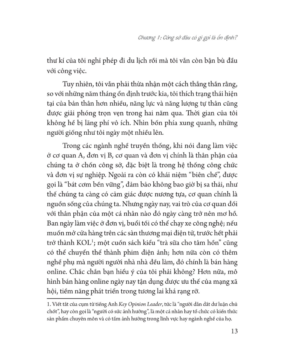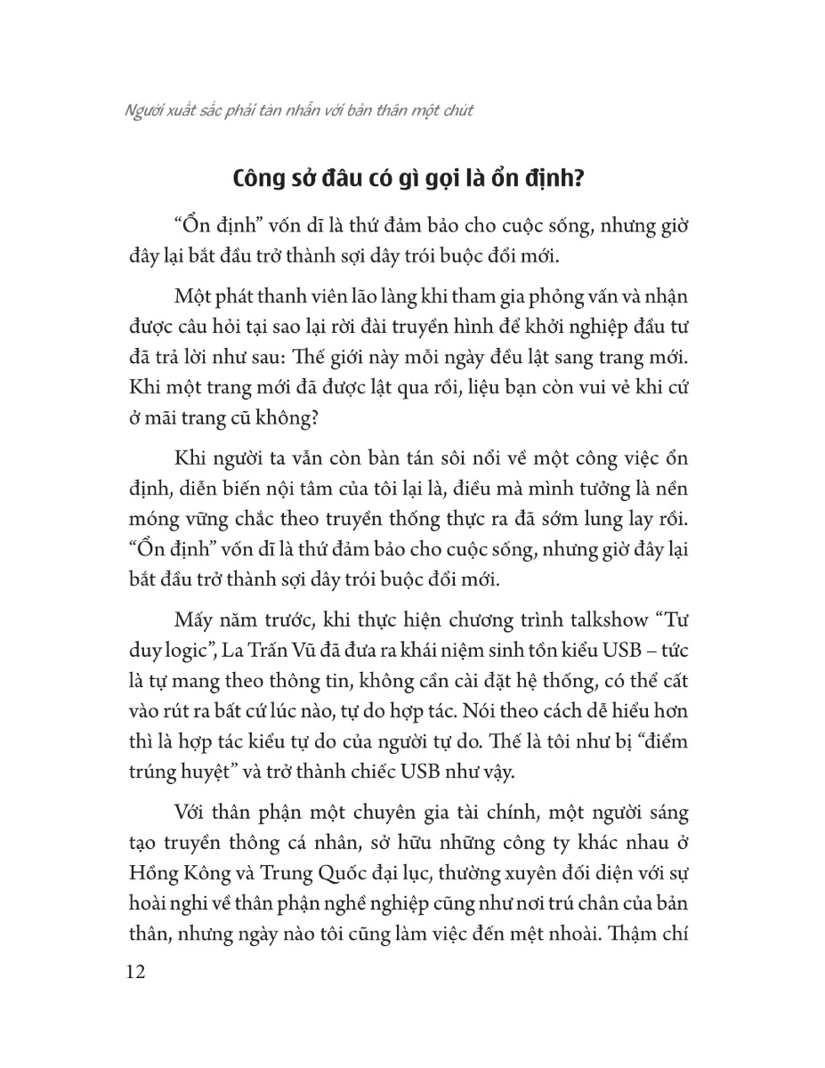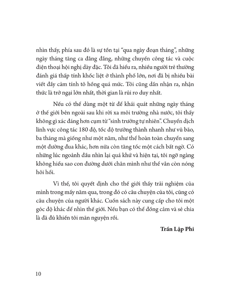 Mua tại TiktokNgười Xuất Sắc Phải Tàn Nhẫn Với Bản Thân Một Chút "So với tương lai đầy những điều không thể đoán trước, tương lai mà nhắm mắt cũng đoán ra được lại khiến tôi sợ hãi hơn." Một cuốn sách giúp bạn sử dụng thời gian tối ưu để làm điều mình muốn. Đây chắc chắn là một thời đại tốt đẹp, chúng ta có thể không cần thỏa hiệp, bắt đầu không chấp nhận việc dùng chi phí thời gian đắt đỏ để chứng minh một kết quả gượng ép. Nhưng đây dường như cũng là một thời đại tồi tệ, vì sức kiên nhẫn với thời gian dường như ngày càng yếu đi, chúng ta không thể nào ngồi yên để chờ thời gian mài giũa. Muốn "trùng tu" chính nội tâm của mình thì cần phải đánh đổi thứ quý giá nhất đối với bản thân, và đó không gì khác ngoài thời gian. Mọi trải nghiệm cảm động và vĩ đại đều ẩn chứa những tinh hoa của thời gian. . Một cuốn sách thôi thúc bạn bước ra khỏi vùng an toàn "ổn định" để trải nghiệm cuộc đời. Hành trình của tác giả Trần Lập Phi là hành trình "chuyển đổi đường đua của cuộc đời". Khi đọc cuốn sách này, bạn sẽ phải tự đặt ra câu hỏi rằng liệu tương lai "ổn định", êm ả không chút bất ngờ có phải tương mà bản thân mong muốn hay không. Bạn sẽ phải làm việc với bản thân, giữa một bên truyền thống là theo đuổi sự yên ổn, thế giới ngoài kia hiểm ác và đầy những điều bất trắc; còn nửa còn lại thì thúc giục bạn trải nghiệm và khám phá nhiều hơn, đừng quá "ổn định" mà kìm hãm chính bản thân mình. Bởi cái bạn coi là "ổn định" cũng chưa chắc là ổn định. "Tôi coi bản thân như một người ngắm nhìn thế giới. Nhiều lúc, vì chưa từng nhìn thấy thế giới bên ngoài, chúng ta mới tưởng rằng phạm vi thế giới mà mình nhìn thấy được chỉ có vậy." Một cuốn sách nhắn nhủ tới bạn, hãy tận dụng triệt để thời gian để khám phá những điều mới. Cuốn sách sẽ cung cấp cho độc giả một góc độ khác để nhìn thế giới. Đời người ngắn ngủi, đừng vì sợ hãi mà bó hẹp cuộc sống bạn chỉ bằng hai từ "ổn định". Hãy đi đến nhiều nơi, gặp gỡ nhiều người, tiếp xúc với nhiều lĩnh vực, học hỏi nhiều kiến thức mới mẻ và ngày ngày tích lũy những điều bổ ích. Để khi nhìn lại, bạn sẽ tự hào khi thấy bản thân mình phát triển và trở nên tốt hơn mỗi ngày.