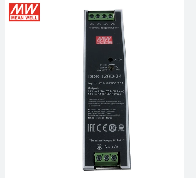 Bộ nguồn Mean Well DDR-120B-24 có các thông số kỹ thuật chính như sau: - Điện áp đầu ra: 24V DC - Công suất: 120W - Dòng điện đầu ra: 5A - Điện áp đầu