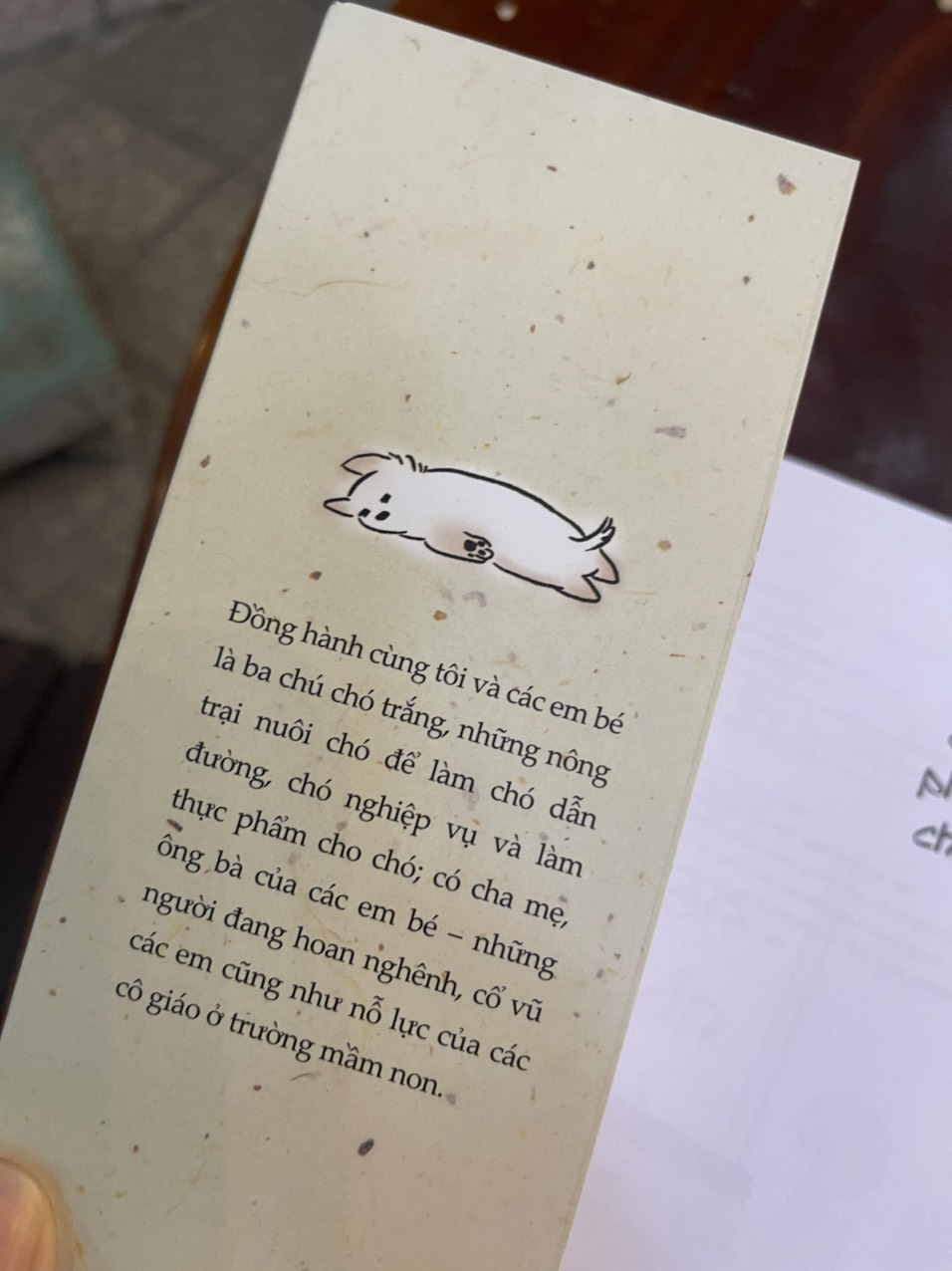 Một bé bốn tuổi vẫn còn đi chưa vững, lấy đá ném vào chú chó bé nhỏ hơn mình. Tại sao bé lại làm như vậy? Bên cạnh, một bé khác lên tiếng ngăn cản bạn. Vậy lúc đó, em bé này đã nghĩ sao? Một bé vốn nghĩ chó chỉ là loài động vật hôi hám, ánh mắt chợt sáng lấp lánh khi nhìn thấy các bạn chó làm việc cho con người. Bé ấy đã cảm thấy điều gì nhỉ? Một bé mỉm cười rạng rỡ khi vuốt ve bộ lông mềm mượt của một chú chó dẫn đường. Tôi thành thật hy vọng các bé có thể trưởng thành và tỏa sáng trong mỗi phút giây như vậy. Đồng hành cùng tôi và các bé là ba chú chó trắng, chó dẫn đường, chó nghiệp vụ của trang trại sản xuất thực phẩm cho chó và cha mẹ, ông bà của các bé – những người đang hoan nghênh, cổ vũ các em cũng như nỗ lực của các cô giáo ở trường mầm non. Tôi có chút e ngại vì sợ năng lực viết nghèo nàn của mình không thể nào truyền tải được toàn bộ những câu chuyện tuyệt vời về trẻ em và động vật. Dù vậy, tôi vẫn hy vọng bạn đọc có thể bỏ qua những thành kiến sẵn có về sách do nhà sư viết, và cảm nhận trọn vẹn tâm hồn đẹp đẽ của trẻ em cũng như sự đáng yêu của những người bạn bốn chân thông qua cuốn sách này.