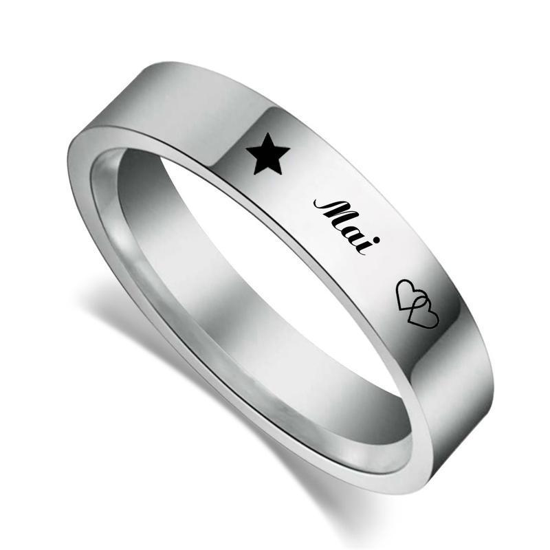 Nhẫn inox theo tên được thiết kế kiểu bản tinh xảo xinh xắn được khắc laser công nghệ hiện đại bật nhất hiện nay với nội dung tên, họa tiết vô cùng đáng yêu. Nhẫn