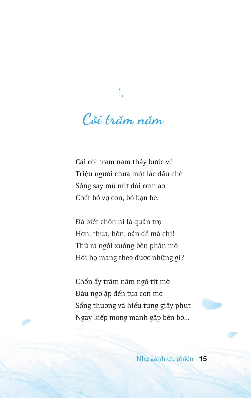 Nhẹ gánh ưu phiền là quyển sách thứ hai của tác giả Như Nhiên Thích Tánh Tuệ sau An nhiên giữa những thăng trầm. Với mong muốn tiếp tục góp thêm một đầu sách giúp quý độc giả vơi nhẹ gánh ưu phiền, tận hưởng niềm hạnh phúc, an lạc ngay trong từng hơi thở, tác giả tiếp tục tập hợp các bài văn, bài thơ vào cuốn sách thứ hai này nhằm truyền tải thông điệp chính: hạnh phúc không ở đâu xa xôi, hạnh phúc đang ở đây, ngay lúc này. Điều quan trọng là đôi mắt bạn có nhìn ra, trái tim bạn có cảm nhận được những niềm hạnh phúc ấy không. Đó cũng chính là giá trị và lợi ích thiết thực của sự tu tập trong Phật giáo. Tu không phải để ngày mai ngày kia sẽ hạnh phúc mà tu lúc nào là hạnh phúc ngay lúc đó.