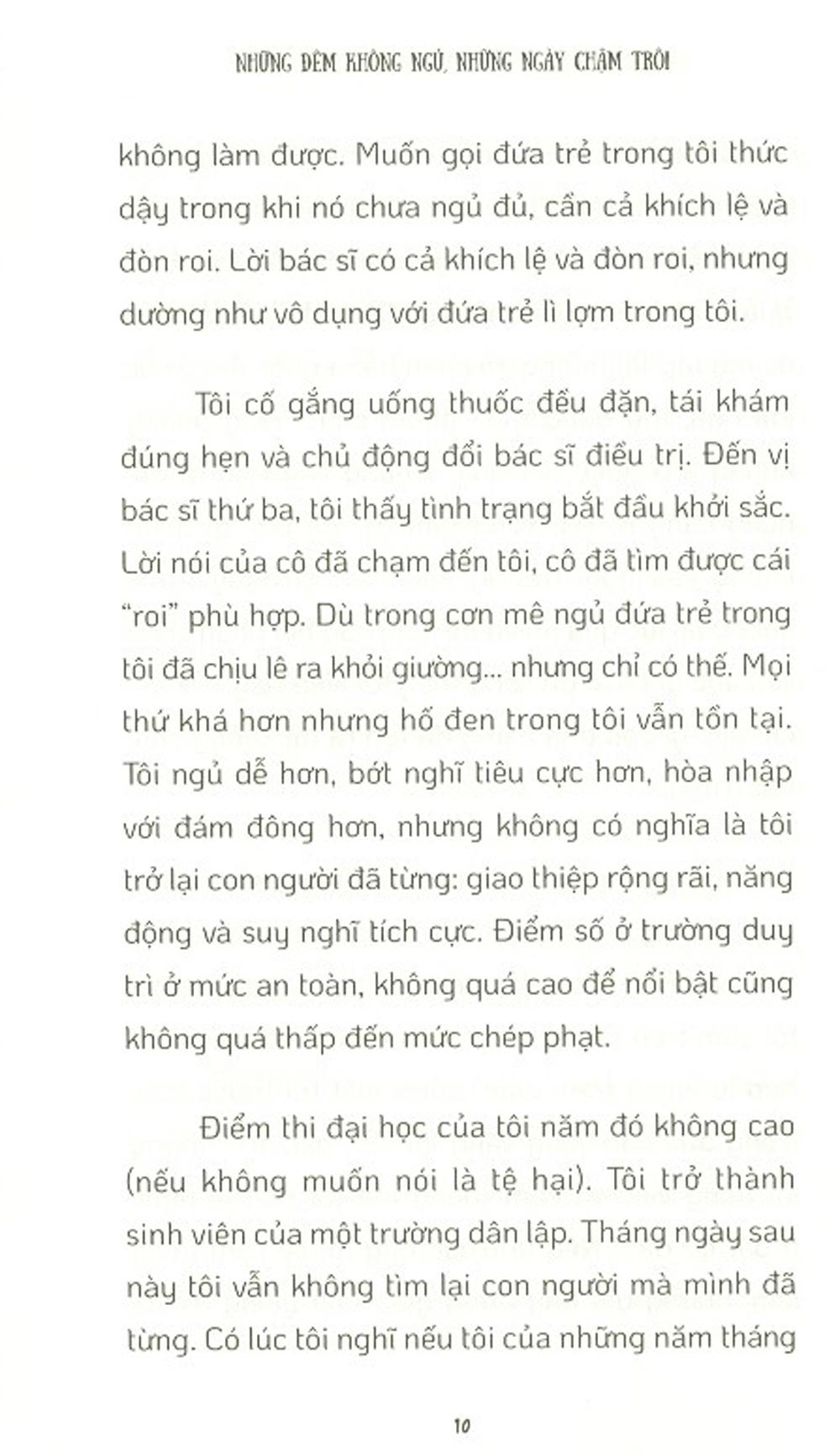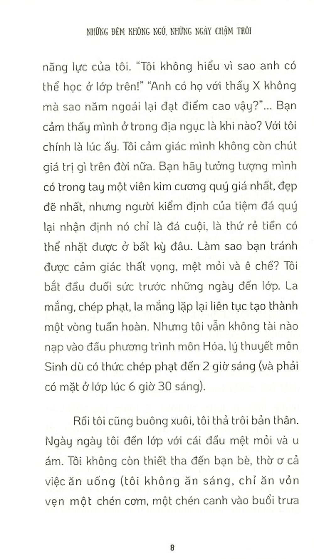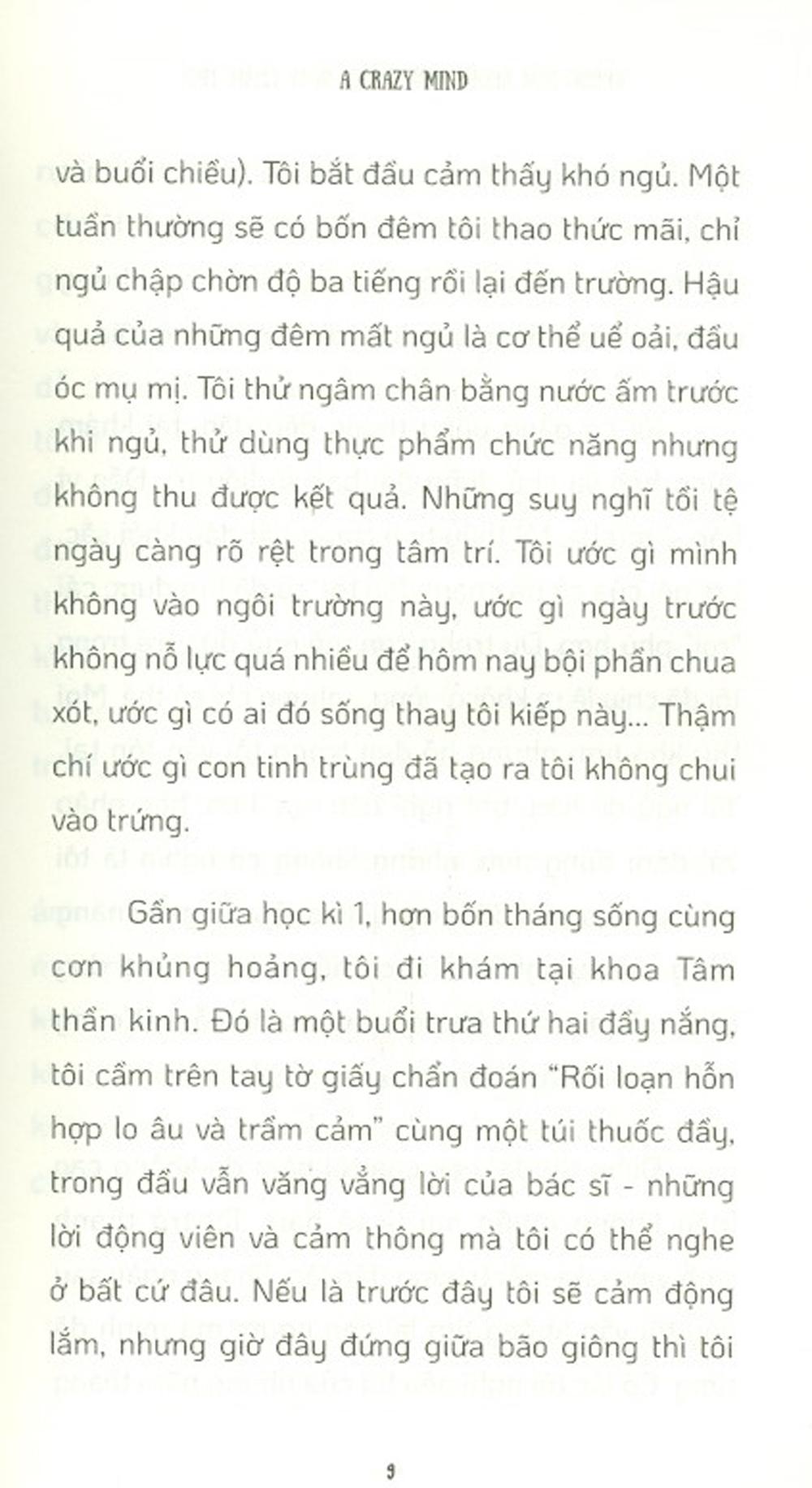 NHỮNG ĐÊM KHÔNG NGỦ NHỮNG NGÀY CHẬM TRÔI - A CRAZY MIND “Những đêm không ngủ, những ngày chậm trôi” đại diện cho một hành tinh mới - nơi nỗi đau tinh thần được đưa ra ánh sáng và chữa lành. Cuốn sách là tập hợp những câu chuyện có thật của những số phận khác nhau đang gặp phải các vấn đề về tâm lý: trầm cảm, rối loạn lo âu, rối loạn lưỡng cực… và những người đang học tập và làm việc trong ngành tâm lý học. “Nếu thế giới này còn thứ gì giữ bạn lại, là tình yêu thương hay sự quan tâm trong phút giây nào đó, mong bạn đừng gạt nó đi, bạn đừng bỏ qua sự cố gắng của bản thân dù nhỏ bé nhất!”- Khải Trạch. Hóa ra tận cùng nỗi đau và tận cùng sự chống chọi là một lòng tha thiết sống, lòng tha thiết bám rễ ở cuộc đời này như thế. “Những đêm không ngủ, những ngày chậm trôi” là một khoảng lặng giữa những nốt nhạc vội vã chạy nhảy giữa cuộc sống hiện đại, để những con người dù mang trong mình những tổn thương tâm lý hay không đều cùng ngồi lại bên nhau, soi tỏ tâm hồn nhau bằng ánh sáng của sự thấu cảm, trao gửi cho nhau thương yêu và kết nối để chữa lành. Thông qua cuốn sách, A Crazy Mind mong muốn đưa một góc nhìn mới đến độc giả về thế giới của những con người đang phải đấu tranh với những nỗi đau tinh thần cũng như những câu chuyện thực tế ít được đề cập của những người đang học tập và làm việc trong ngành tâm lý học. Đây không phải cuốn sách đọc để giải trí, mà là một bức tranh “cảm xúc” được ghép từ những câu chuyện đủ đầy các mảng sáng tối lẩn khuất thẳm sâu trong tâm hồn. Hy vọng đây là một món ăn tinh thần làm đầy thêm sự phong phú trong tâm hồn bạn.