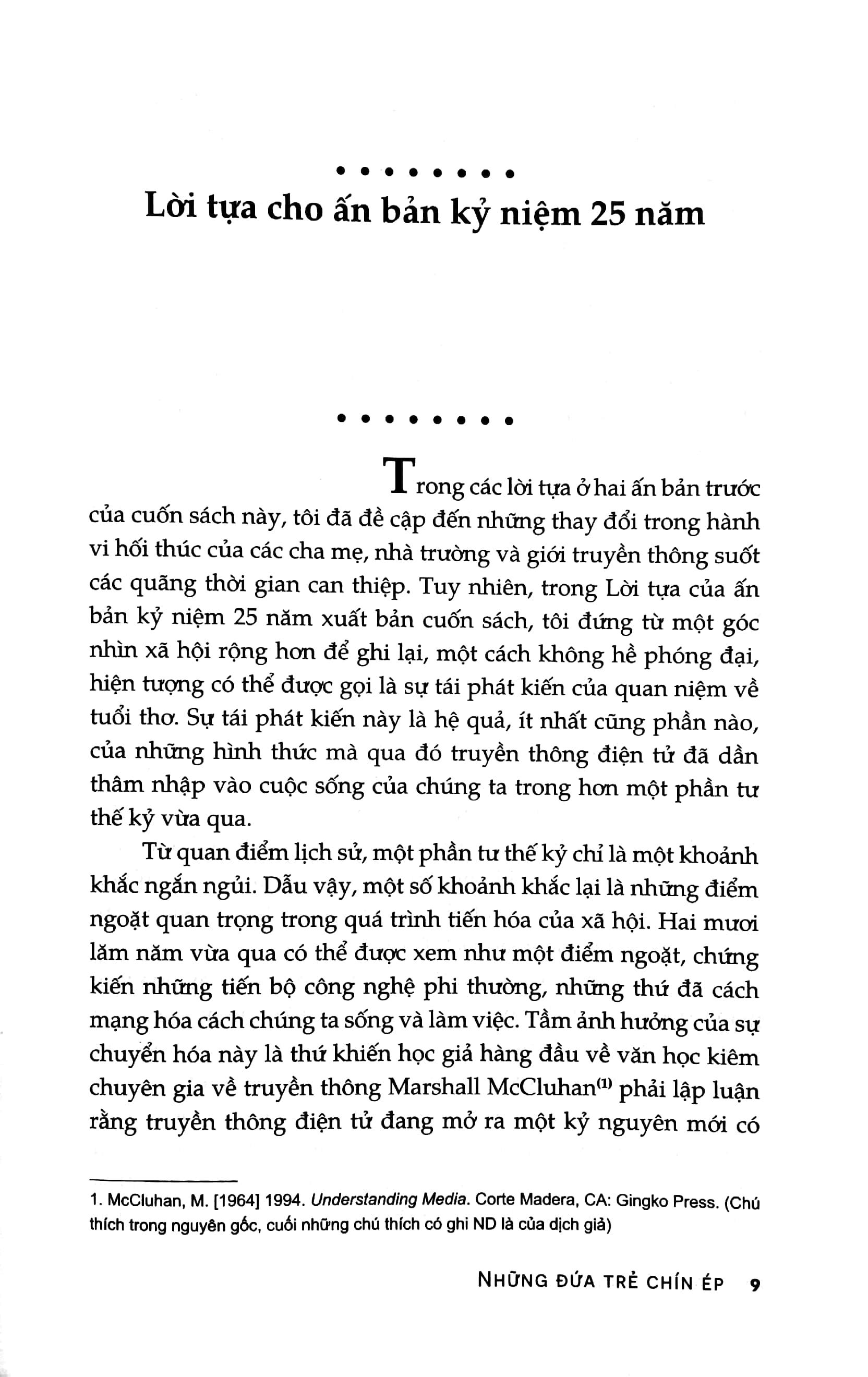 Chúng ta đang sống trong một xã hội hối thúc và bị hối thúc. Chúng ta luôn đặt ra mục tiêu: làm nhanh hơn, khẩn trương hơn. Siêu thị giúp chúng ta đi chợ trong chốc lát. Các cửa hàng ăn nhanh giải quyết việc ăn uống chóng vánh. Cao tốc giúp chúng ta rút ngắn thời gian di chuyển, vận chuyển. Và cuộc cách mạng đương đại trong xử lý thông tin cho chúng ta nguồn thông tin nhanh hơn, chính xác hơn, giải quyết khối lượng công việc ngày càng chất cao như núi. Thậm chí đến việc nghỉ ngơi giải trí của chúng ta cũng bị hối thúc với các phương tiện tự động như máy đặt con ki, máy ném bóng, du thuyền siêu tốc… Chúng ta sống trong một xã hội bị quy định bởi giờ giấc, tiến độ. Vậy nên, món quà thực dụng mà chúng ta thường tặng con cái là gì: Một chiếc đồng hồ. Việc hối thúc trẻ đang trở thành lối sống được xã hội chấp nhận, thậm chí coi trọng. Sự hối thúc đi kèm với sự thiếu kiên nhẫn. Vì sao? Vì việc hối thúc phản ánh các giá trị văn hóa, ví dụ như văn hóa đúng giờ, và viện đến các giá trị đó người ta sẽ biện hộ cho việc hối thúc trẻ. Chúng ta hối thúc các con bởi chúng ta hối thúc chính mình. Nhưng điều đó sẽ khiến suy nghĩ, cảm thức của trẻ về niềm tin, lòng tốt, sự an toàn và nhân từ khoan dung của thế giới này bị tổn hại.