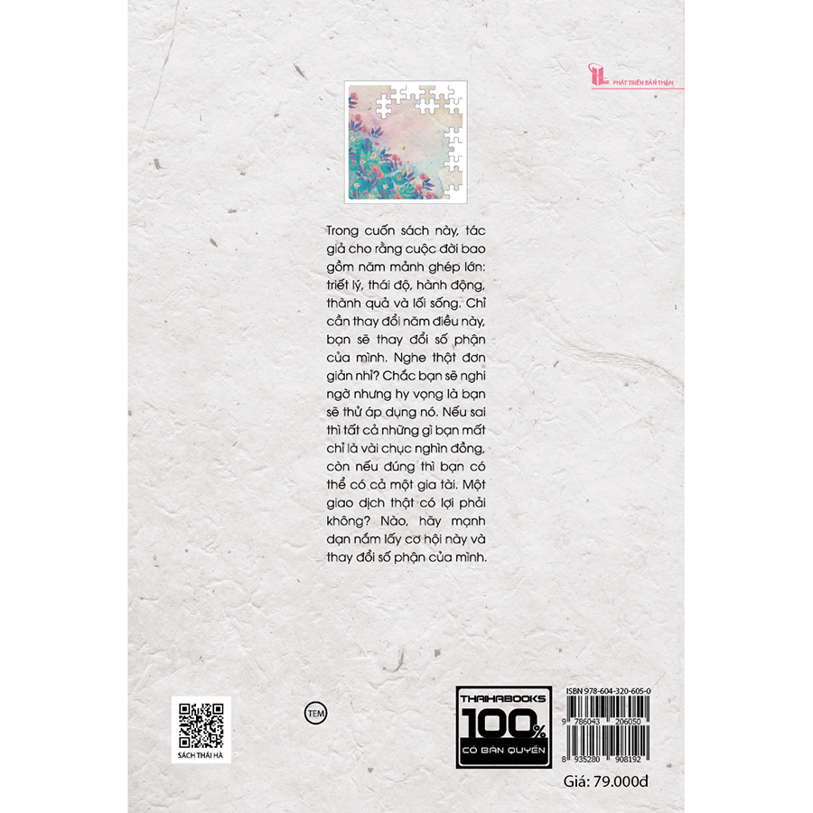 Trong Những mảnh ghép cuộc đời, Jim Rohn cho rằng cuộc đời gồm năm mảnh ghép lớn: triết lý, thái độ, lối sống, hành động và thành quả. Bằng lối viết cô đọng đầy tinh tế, khả năng dụng ngôn giàu hình ảnh, Jim Rohn lần lượt dẫn dắt chúng ta đến với từng mảnh ghép ở các vị trí quan trọng khác nhau của cuộc đời, quá trình nó hình thành và những chất liệu để bạn có thể tạo nên một mảnh ghép hoàn chỉnh. Và rồi khi khép lại cuốn sách, khi bức tranh cuộc đời sẽ được lắp ghép hoàn thiện, chúng ta sẽ thay đổi số phận của mình mãi mãi.