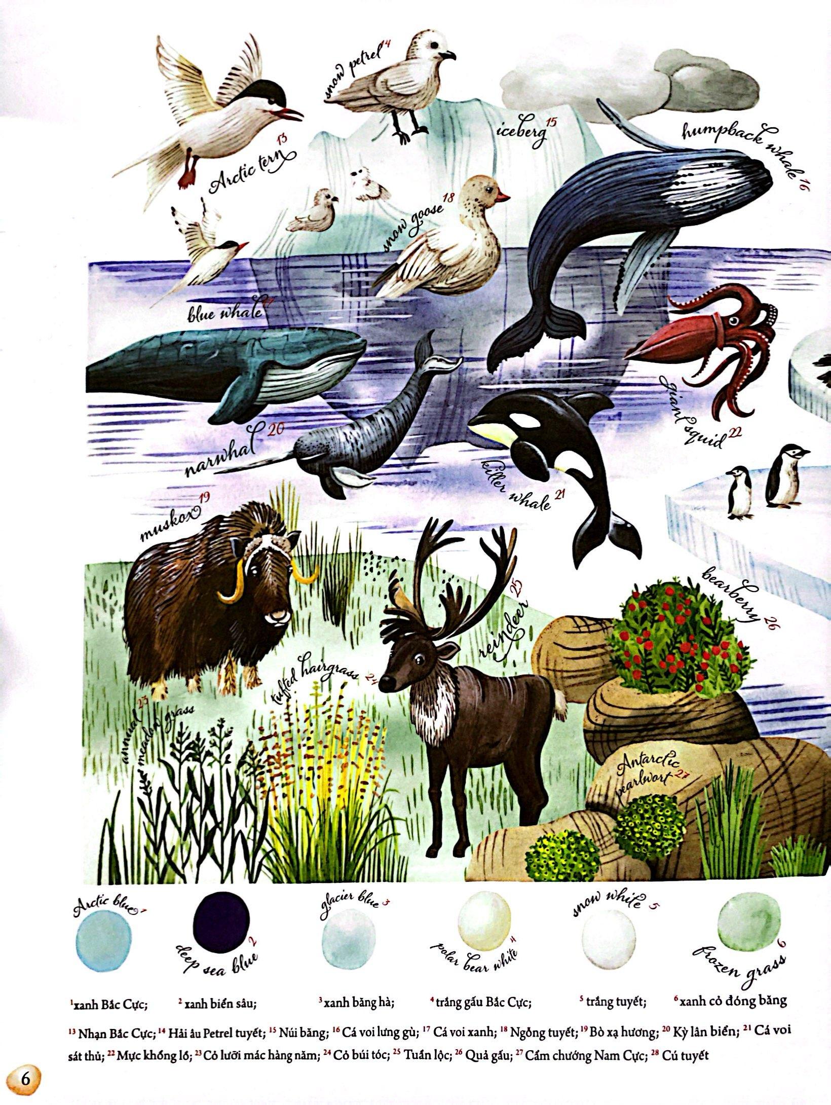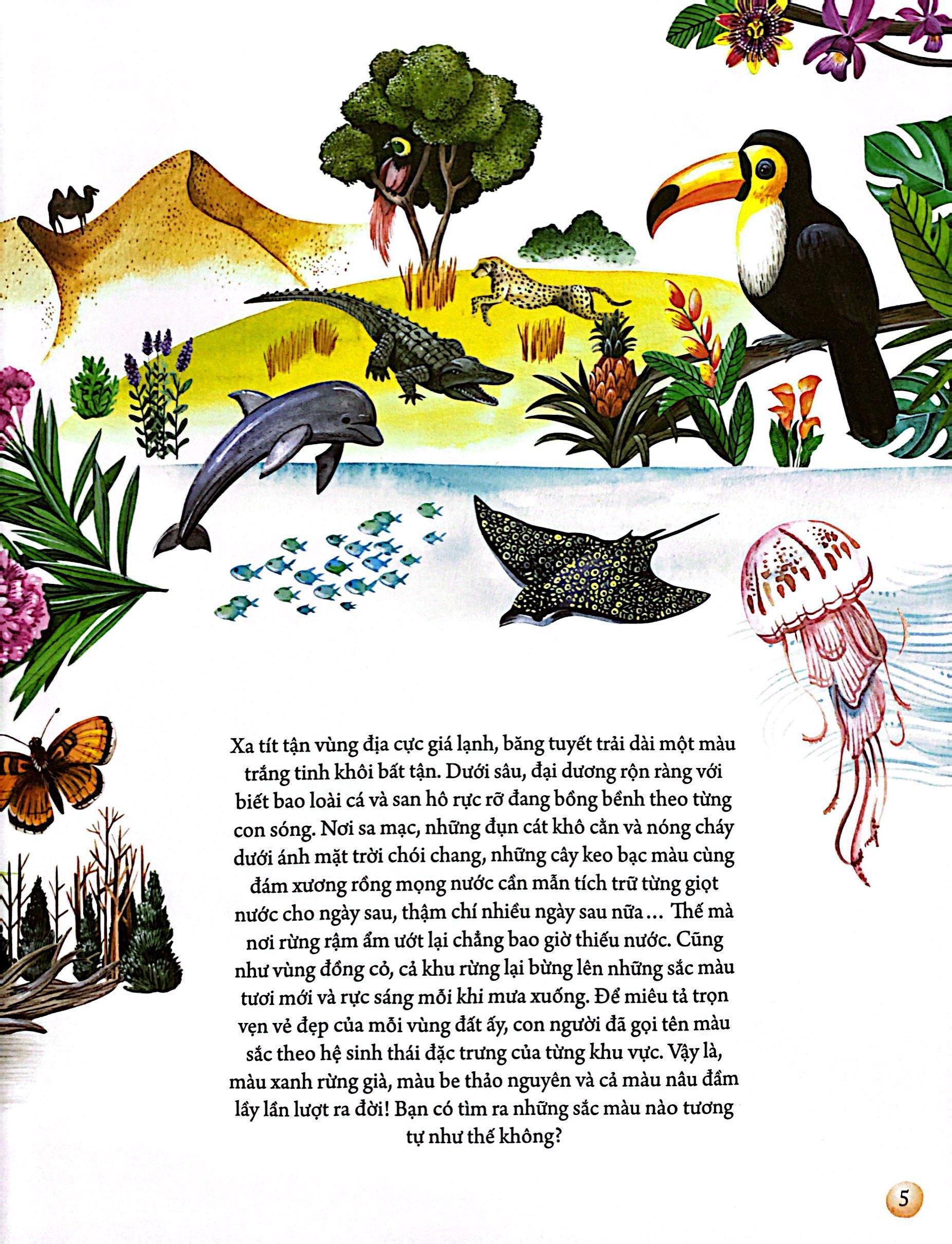 Mỗi hệ sinh thái trên thế giới rộng lớn này đều được thiên nhiên tô vẽ bằng một bảng màu độc đáo. Vùng địa cực băng giá lấp lánh nhờ tông màu trắng và lam, nơi rừng xanh rộn ràng vũ điệu của sắc màu trái cây miền nhiệt đới và thảo nguyên ngợp cỏ lặng lẽ nép mình trong sắc be dịu dàng. Hãy cùng dạo bước tới những vùng xa xôi nhất và khám phá các sắc màu ẩn hiện nơi đó ngay bây giờ, trong chính những trang sách trước mặt bạn!