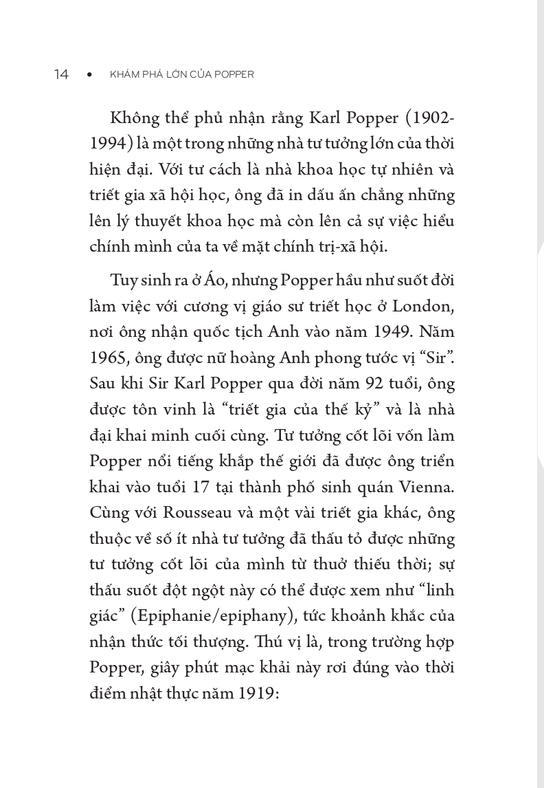 - Giới thiệu Những Nhà Tư Tưởng Lớn - Popper In 60 Minuten - Popper Trong 60 Phút Popper nêu ra lý tưởng về khoa học của “xã hội mở“: Mọi lý thuyết khoa học đều chỉ có giá trị hiệu lực cho đến khi nó bị phản bác bởi một ví dụ phản chứng hoặc bị thay thế bởi một lý thuyết chính xác hơn. Xã hội phải luôn luôn cởi mở đối với việc phê phán và đổi mới nhận thức của chúng ta Phương pháp thử và sai in dấu ấn lên sự tiến hóa. Từ muôn thuở, thực vật và động vật tối ưu hóa cơ may sống còn bằng những đột biến thất bại và thành công: Khoảng cách từ trùng a-míp đến Einstein chỉ là một bước. Triết học cho mọi người! Bộ sách Những nhà tư tưởng lớn lần đầu tiên trình bày sâu sắc công trình của các nhà triết học quan trọng nhất: Dễ hiểu, thú vị và rất thời sự.” – Martin Politowski “Tất cả đều được trình bày hết sức rành mạch: Phê phán của Popper đối với mọi chủ nghĩa toàn trị, yêu sách về xã hội mở, sự khích lệ những bước đi táo bạo trong khoa học và chính trị. Một gợi ý quan trọng trong thế giới đang tự mãn với chủ nghĩa tiêu thụ và lúng túng trong chính trị.”