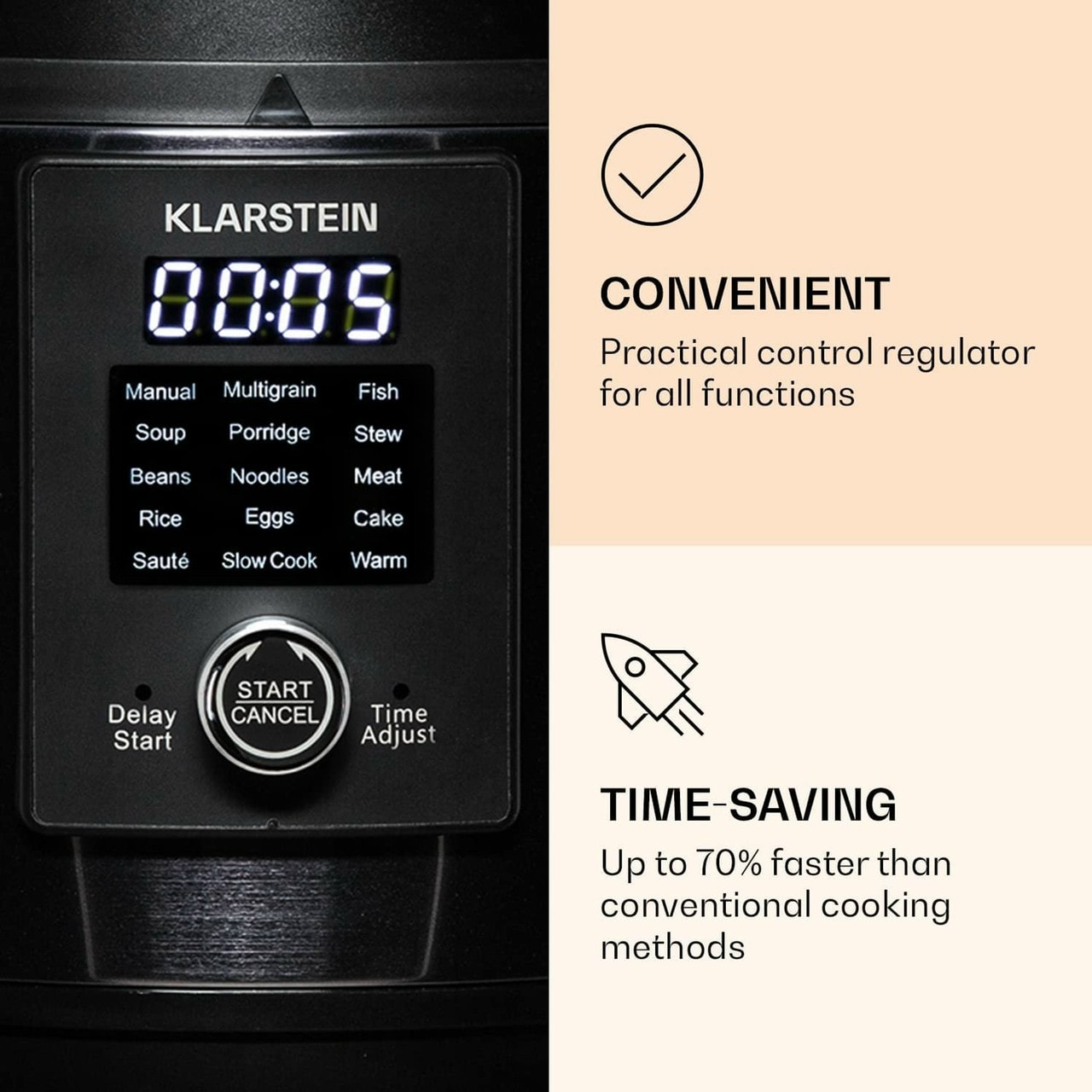 Đặc điểm nổi bật của Nồi áp suất điện đa năng Klarstein 4.8 lít Nhiều chức năng nấu: nấu nhanh, áp chảo và nấu chậm trong một. Bếp từ đa chức năng Quick Cook của Klarstein