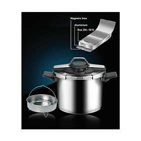 Nồi áp suất cao cấp Aroma. Nồi được thiết kế 2 tay cầm ngắn và 1 tay cầm dài chắc chắn và an toàn khi sử dụng Nồi cấu trúc đáy 3 lớp theo phương thẳng giúp truyền và giữ nhiệt tối ưu, tiết kiệm năng lượng Chất liệu: Toàn thân nồi inox SUS304 - 18/10 dày 1.2mm tiếp xúc thực phẩm an toàn và giữ nhiệt lâu hơn Đáy nồi sử dụng nhiều lớp và lớp nhôm dày 7mm, được chế tạo bằng máy tạo áp lực ma sát, khiến nồi có thể truyền nhiệt đồng đều hơn Van đều áp, điều chỉnh 3 mức để người dùng chọn bất kì mức áp suất nào phù hợp vs nhu cầu nấu Nồi còn được + thêm một xửng hấp và 1 vung kính nâng cao hiệu xuất tối đa sử dụng Sản phẩm sử dụng trên mọi loại bếp: bếp từ, bếp hồng ngoại, bếp gas, máy rửa bát Thông số kỹ thuật Tổng độ dày tiêu chuẩn toàn thân: inox 304 - 18/10 dày 1.2mm Đáy nhôm truyền dẫn nhiệt dày 7mm Đường kính: 22cm Van chống mở an toàn Bộ điều áp 3 tốc độ Áp suất hoạt động: Mức 1 60Kpa, Mức 2 100Kpa, PS: 300kPa Dung tích: 6 lít