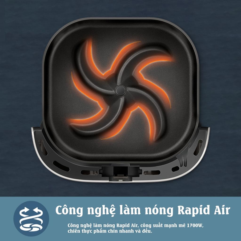 -Với công nghệ Rapid Air, Airfryer luân chuyển khí nóng xung quanh giỏ nấu bọc lưới kim loại, sử dụng ít dầu hoặc không dùng dầu khi chiên rán, nướng thịt và nướng bánh.