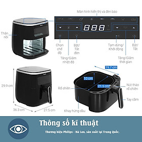 Màn hình cảm ứng với các chức năng cài đặt trước. Chạm vào một nút và nấu. Các chương trình đặt trước bao gồm đồ ăn nhẹ, đông lạnh, khoai tây chiên tươi, thịt, cá, đùi gà, bánh và thậm chí cả rau nướng.