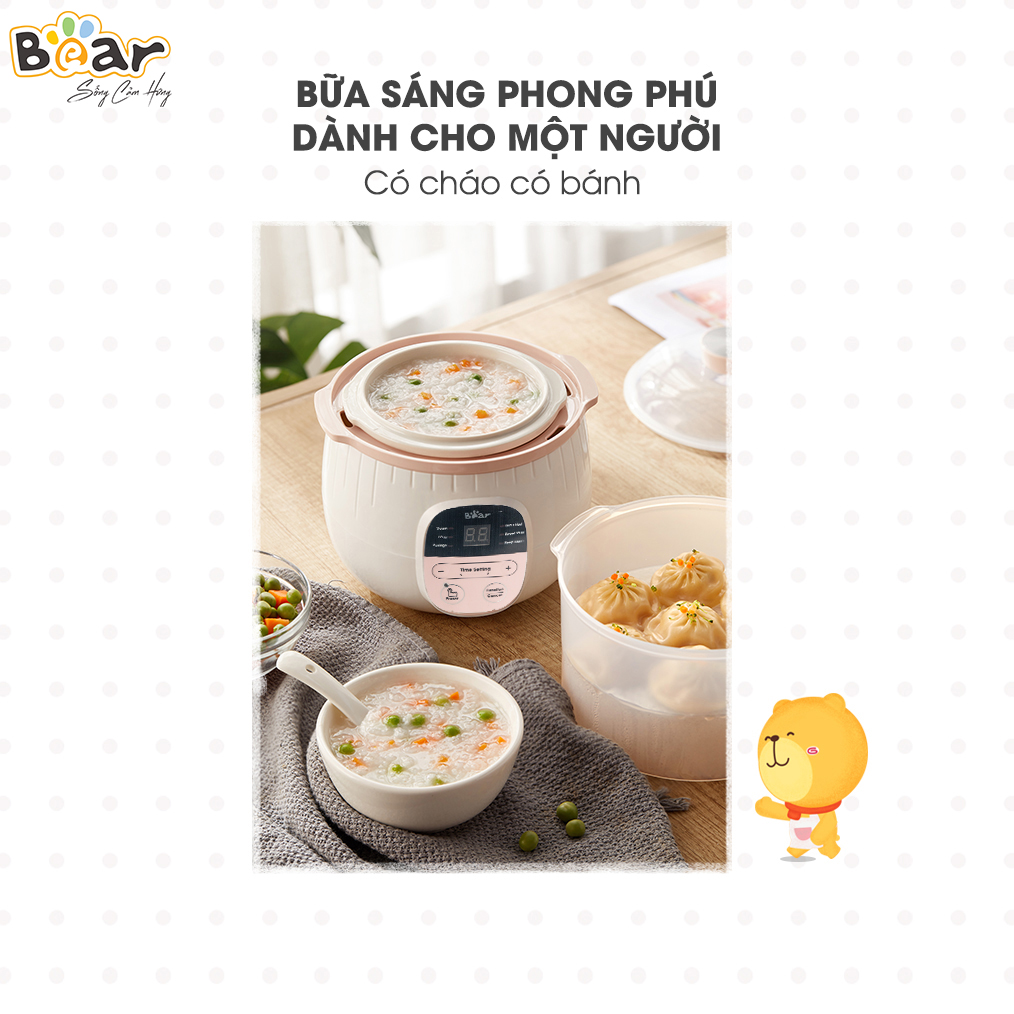 Mua tại TiktokNồi nấu chậm 0.8L Bear DDZ-B08C1 (SUBE001) phiên bản quốc tế với 6 tính năng nấu thông minh, tích hợp bảng điều khiển tiếng anh, hướng dẫn tiếng việt và chân cắm 2 chấu phù hợp với ổ cắm tại Việt Nam. Sở hữu nhiều ưu điểm nồi bật về tính năng và thiết kế nồi nấu cháo chậm Bear quốc tế chắc chắn mang đến cho bạn những trải nghiệm tốt nhất. Nồi nấu chậm nhỏ gọn - đẹp mắt Không chỉ sở hữu nhiều tính năng hiện đại nồi nấu chậm Bear 0.8L còn có thiết kế nhỏ gọn vô cùng bắt mắt. Kết cấu nồi bao gồm 1 thố sứ nhỏ nấu cháo 0,8 lít, 1 vỏ nồi chất liệu ABS với tông màu sáng, 1 lồng hấp dung tích 1 lít dùng để hấp rau củ và bánh bao trong lúc nấu cháo siêu tiện lợi. Mặc dù có thiết kế nhỏ gọn nhưng với dung tích nồi nấu cháo chậm 0,8 lít thì Bear DDZ-B08C1 (SUBE001) vẫn thích hợp sử dụng cho bé yêu của bạn, nấu từ 1-2 bữa ăn trong ngày cho bé tùy vào giai đoạn tuổi của bé. Không chỉ thích hợp dùng để nấu cháo, dung tích nồi còn phù hợp làm món hầm, hấp với lượng thức ăn ít, phù hợp cho 1-2 người ăn. Thiết kế nồi nấu cháo Bear từng chi tiết tháo rời rất tiện lợi cho việc vệ sinh và cất giữ sau khi sử dụng. Đặc biệt, bề mặt nồi nấu cháo chậm có thiết kế dạng nhẵn bóng, chống bám bẩn và dễ lau chùi hơn. Nồi nấu cháo Bear đa năng - hấp hầm trong 1 Sở hữu thiết kế 2 tầng thông minh bạn có thể cùng lúc nấu món hấp và hầm với em nồi nấu cháo chậm 0,8 lít của nhà Bear nhé. Từ giờ trong lúc nấu cháo cho bé yêu mẹ có thể hấp thêm rau củ, khoai hoặc ngô cho bé tập ăn dặm, có một bữa ăn đầu đủ dinh dưỡng mà lại siêu tiết kiệm thời gian. Đặc biệt, nồi nấu chậm Bear bản quốc tế loại 0,8 lít còn được tích hợp đến 6 chức năng nấu thông minh: nấu cháo, hầm canh, hấp/luộc, hầm tổ yến, nấu chè và chế độ nấu tự động. Chỉ với một em nồi nhỏ gọn này bạn có thể chế biến đồ ăn cho bé theo nhiều kiểu khác nhau hoặc làm các món ăn khác trong gia đình vẫn vô cùng tiện lợi. Chất liệu cao cấp - an toàn cho bé Chất liệu nồi nấu cháo chậm Bear vô cùng lành tình cho bé yêu và đảm bảo an toàn cho mẹ khi sử dụng. Lõi nồi làm bằng sứ trắng cao cấp đảm bảo không có phản ứng hóa học khi sinh nhiệt hay tiếp xúc với thức ăn, thân nồi và lồng hấp được làm bằng nhựa ABS chịu nhiệu đảm bảo an toàn về cách điện khi sử dụng, nhựa cao cấp không chứa hay thôi ra chất độc hại khi sử dụng. Trong trường hợp lõi sứ bị hư hỏng hay rơi vỡ bạn hoàn toàn có thể liên hệ với Bear Việt Nam để mua bổ sung phụ kiện lõi sứ nồi nấu chậm Bear nhé cả nhà. Bear Việt Nam ngoài việc cung cấp thông tin hướng dẫn sử dụng nồi nấu cháo chậm Bear còn chuẩn bị mọi phụ kiện để phục vụ nhu cầu phát sinh trong quá trình sử dụng sản phẩm của bạn. Phương pháp nấu cách thủy giữ trọn dưỡng chất Điểm đặc biệt của nồi nấu cháo chậm Bear so với các loại nồi nấu cháo chậm khác trên thị trường đó chính là sử dụng phương pháp nấu cách thủy. Ưu điểm của việc nấu cách thủy là giúp thức ăn chín từ từ, không bị biến đổi chất, không bị bay hơi mất chất dinh dưỡng trong quá trình nấu. Vì vậy, với em nồi nấu chậm Bear cách thủy cả nhà hoàn toàn có thể yên tâm về việc bé yêu có một bữa ăn giàu dinh dưỡng mỗi ngày nhé. Hẹn giờ nấu lên đến 9,5 giờ tiện lợi Nồi nấu chậm Bear 08 DDZ-B08C1 còn được tích hợp tính năng hẹn giờ nấu thông minh từ 1 tiếng đến 9,5 tiếng. Với tính năng hẹn giờ dài và tự động chuyển sang chế độ giữ ấm khi nấu xong, mẹ có thể chuẩn bị cháo cho bé từ tối hôm trước và chọn chế độ nấu hẹn giờ, sáng hôm sau không cần dậy sớm tất bật mà bé yêu vẫn có món cháo bổ dưỡng. Nếu bạn là một bà mẹ bận rộn thì em nồi nấu cháo đa năng Bear SUBE001 này là lựa chọn hoàn hảo dành cho bạn. Ngoài chế độ tự động giữ ấm 3 giờ sau khi nấu xong bạn cũng có thể tự động điều chỉnh thời gian giữ ấm thủ công với em nồi nấu cháo Bear này nhé. Chỉ với 1 thao tác đơn giản bé yêu luôn có cháo nóng để thưởng thức cho bữa kế tiếp. Hướng dẫn sử dụng nồi nấu cháo chậm Bear Cách sử dụng nồi nấu cháo chậm Bear vô cùng đơn giản và dễ dàng nhé. Để có một món ăn hoàn hảo bạn chỉ cần làm theo 3 bước sau đây: Bước 1: Cho nước sạch vào thân nồi nấu chậm Bear, lưu ý không đổ nước quá vạch max. Bước 2: Cho thực phẩm và gia vị vào lõi sứ, nêm nếm vừa ăn rồi đặt vào nồi nhé. Bước 3: Ấn chọn chế độ nấu và thời gian nấu, sau 5 giây nồi sẽ tự động chuyển sang chế độ nấu mà bạn lựa chọn. Sau đó bạn chỉ cần theo dõi thời gian nấu trên nồi kết thúc là thức ăn sẽ chín đều và bỏ ra tô để thưởng thức nhé. Tích hợp bảng điều khiển tiện lợi Nồi nấu cháo chậm Bear phiên bản quốc tế được tích hợp bảng điều khiển tiếng anh kè