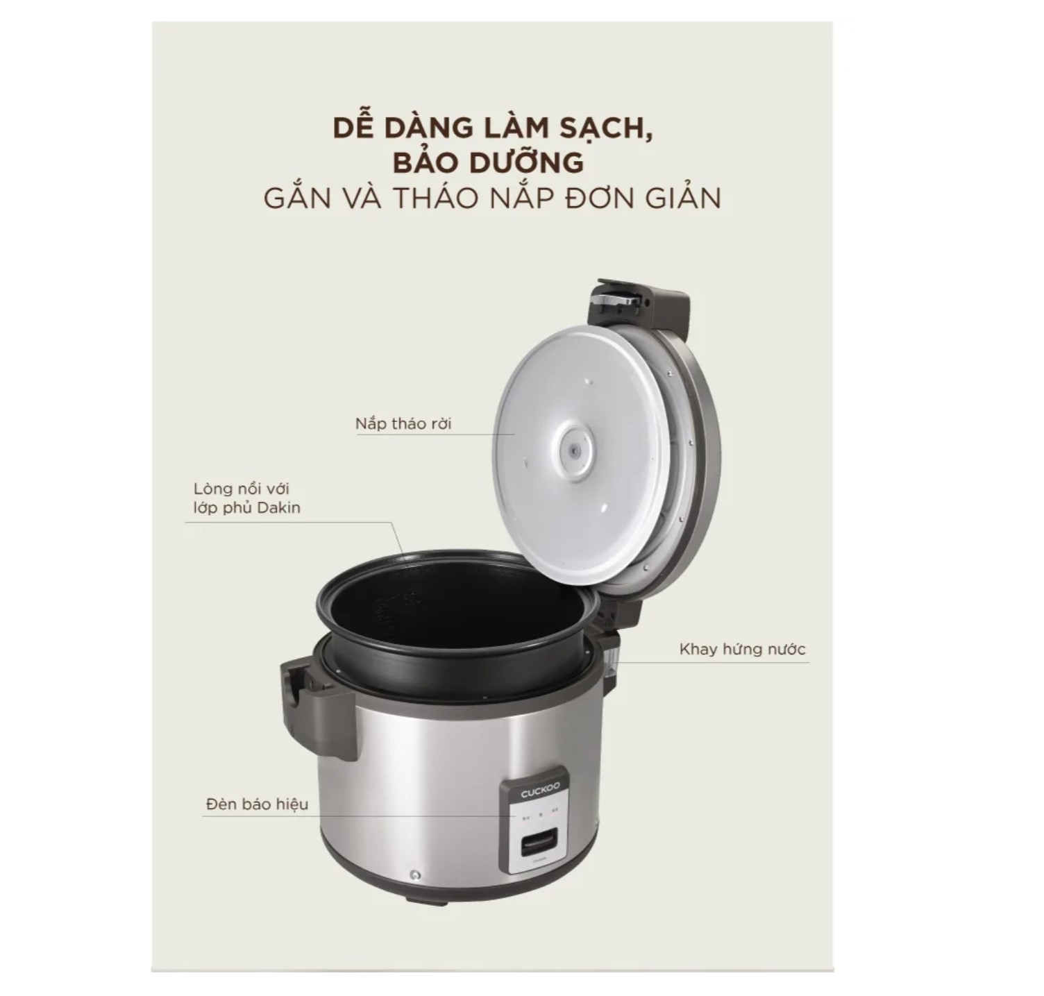 Nồi cơm nắp gài 6.3 lít Cuckoo CR-3555/BKSTVNCRCV được trang bị khay thoát nước thông minh tiện tháo rời, tự động lấy nước ngưng tụ trong quá trình nấu để giữ nguyên hương vị tươi ngon của hạt gạo.