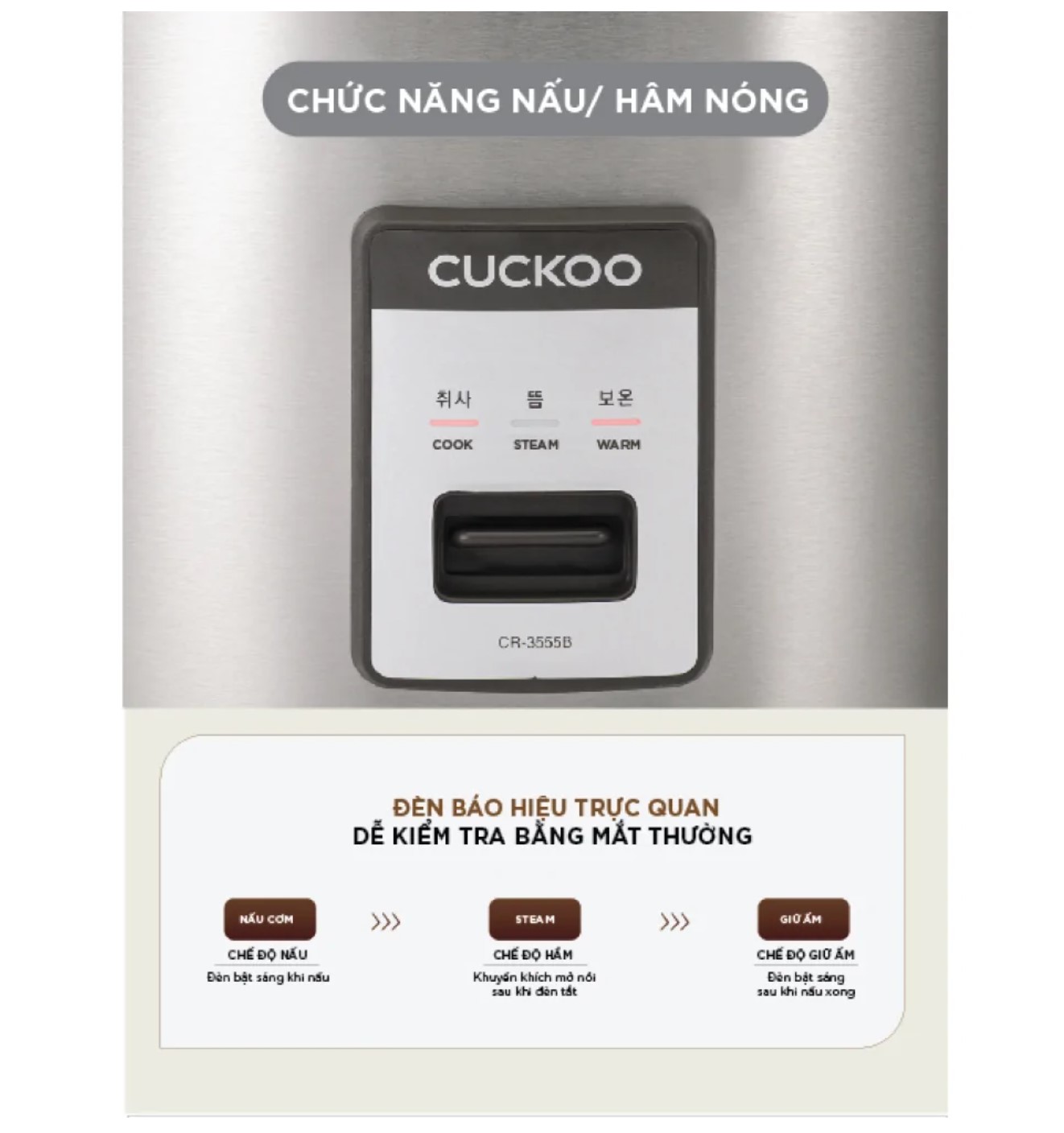 Nồi cơm nắp gài 6.3 lít Cuckoo CR-3555/BKSTVNCRCV có bảng điều khiển nút gạt với đèn báo hiển thị cho bạn tiện quan sát quá trình hoạt động của nồi. Tính năng giữ ấm giúp các món ăn như món canh, món súp, món hầm, luôn nóng hổi cho bạn thưởng thức bữa ăn trọn vẹn hơn.