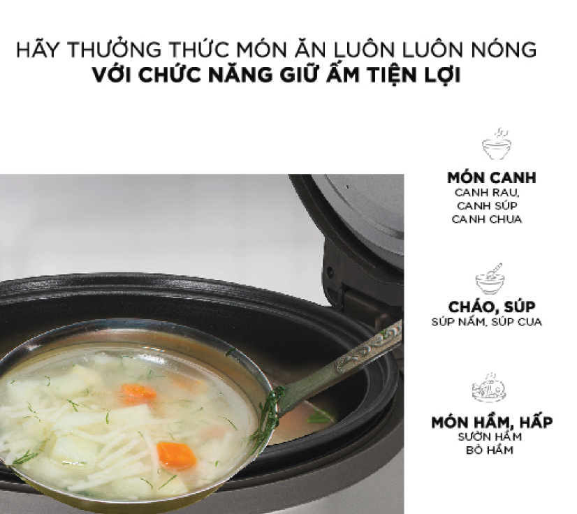 Lòng nồi phủ men chống dính Tefalon Cấu tạo 2 vung giúp cơm ngon, nắp phụ có thể tháo rời dễ dàng vệ sinh Giữ nhiệt hiệu quả với công nghệ giữ nhiệt 3 chiều