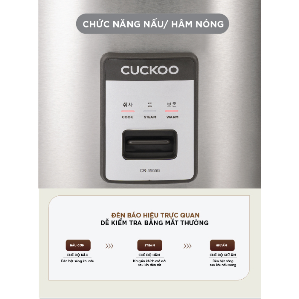 Nồi cơm Cuckoo CR-3555 là chiếc nồi cơm điện công nghiệp mang thương hiệu nổi tiếng Cuckoo của Hàn Quốc. Nồi hoạt động với công suất lớn, lên tới 1.460W cùng hệ thống công nghệ gia nhiệt 3D giúp cơm chín đều, nhanh chóng và giữ nguyên được dưỡng chất trong hạt gạo.