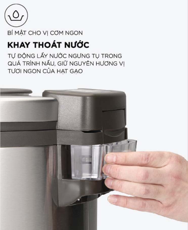 Thiết kế chắc chắn, gọn gàng, sử dụng tiện lợi với thân inox sáng bóng, tay cầm cách nhiệt an toàn 2 bên cùng với khay đựng nước tháo lắp dễ dàng đằng sau.