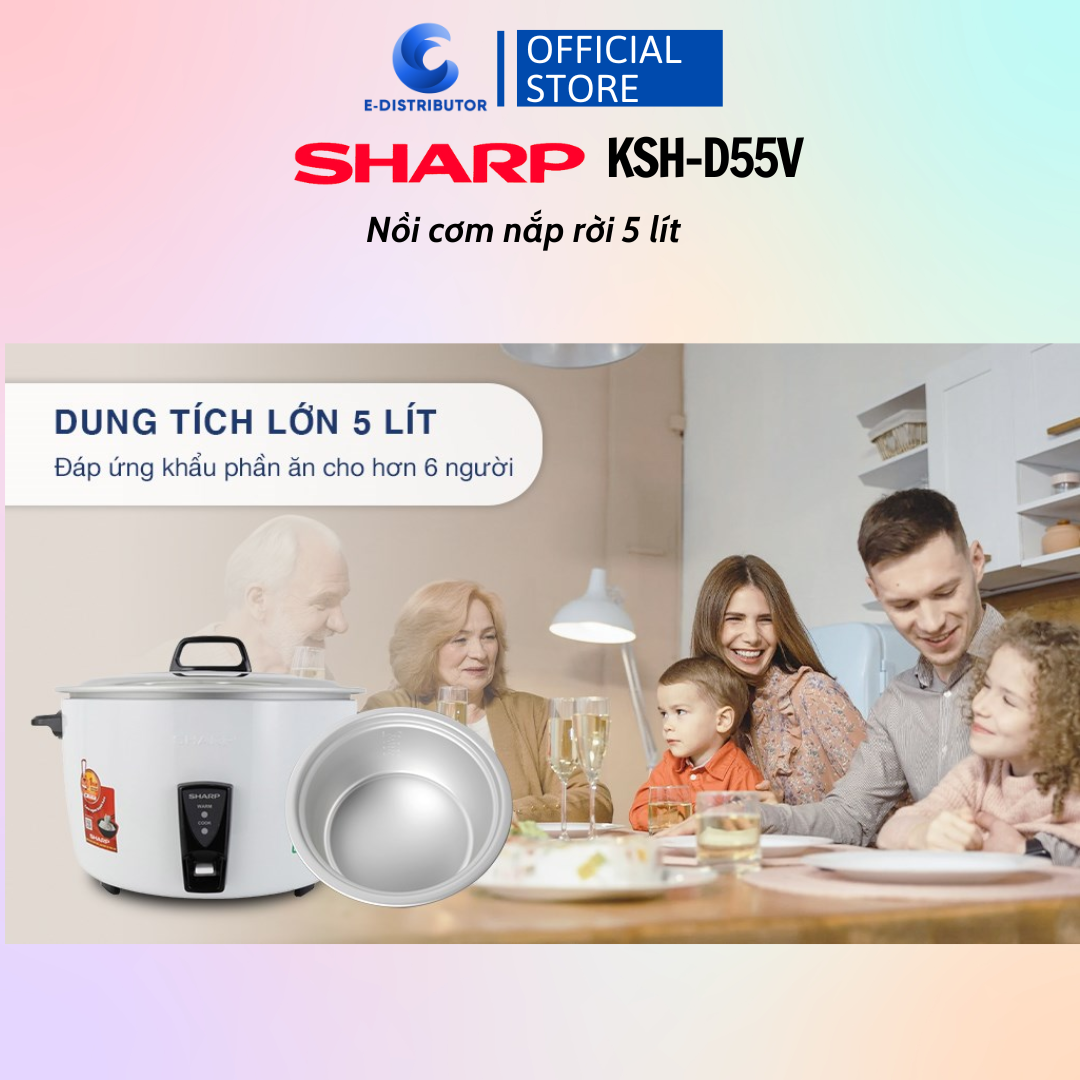 Thông số kỹ thuật Nồi cơm nắp rời Sharp 5 lít KSH-D55V - Loại nồi: Nồi cơm nắp rời - Dung tích: 5 lít, Số người ăn 8 - 15 người - Công suất: 1550W - Lòng nồi dày: 1.858 mmNhôm không chống dính - Điều khiển: Nút gạt - Tiện ích: Thiết kế tay cầm tiện lợi - Thương hiệu của: Nhật Bản - Hãng Sharp Thông số kỹ thuật Nồi cơm nắp rời Sharp 7 lít KSH-D77V - Loại nồi: Nồi cơm nắp rời - Dung tích: 7 lít, Số người ăn 15 - 20 người - Công suất: 2000W - Lòng nồi dày: 1.913 mmNhôm không chống dính - Điều khiển: Nút gạt - Tiện ích: Thiết kế tay cầm tiện lợi - Thương hiệu của: Nhật Bản - Hãng Sharp Thiết kế nắp rời, tiện dụng
