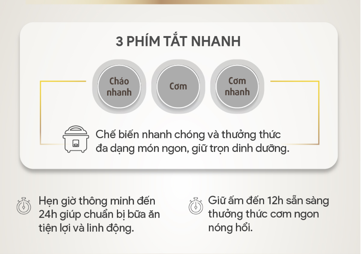 8 chế độ: Cơm, Cháo, Súp, Hâm nóng, Cháo trẻ em, Cơm mềm, Cơm gạo lứt, Hấp và 3 phím tắt nhanh gồm Cháo nhanh, Cơm, Cơm nhanh.
