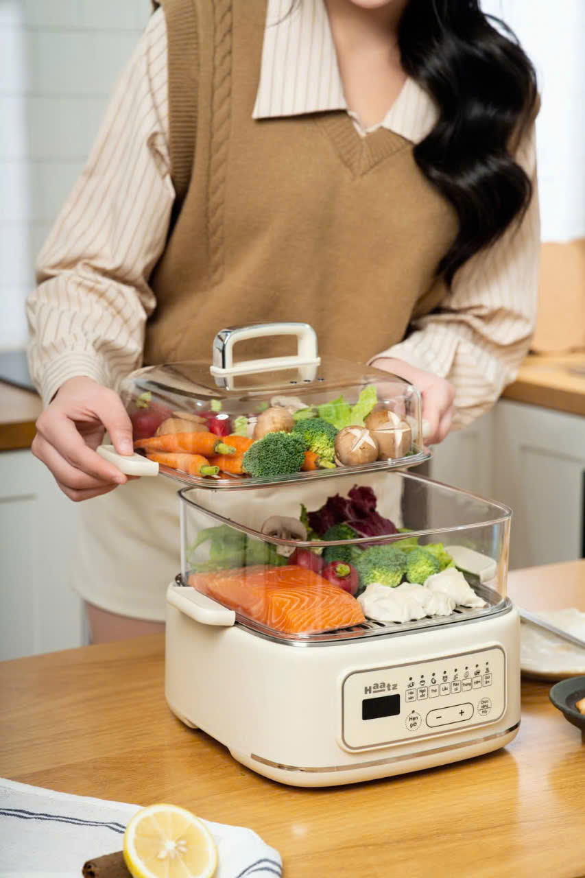 Haatz là một thương hiệu gia dụng uy tín tại Hàn Quốc, nhận được sự tin tưởng, đồng hành của hàng triệu người dùng tại xứ sở kim chi. Có mặt tại Việt Nam từ năm 2024, Thương hiệu đồ gia dụng Haatz luôn mong muốn mang đến cho người tiêu dùng những trải nghiệm tốt nhất khi sử dụng mỗi sản phẩm, hướng tới sự hài lòng và an tâm của khách hàng Việt MÔ TẢ SẢN PHẨM NỒI HẤP 2 TẦNG HAATZ đa năng là sự lựa chọn hoàn hảo cho gia đình bạn. Với thiết kế hiện đại, chất liệu cao cấp và công nghệ tiên tiến, sản phẩm này không chỉ giúp bạn nấu ăn nhanh chóng mà còn giữ được hương vị và dinh dưỡng của thực phẩm. ĐẶC ĐIỂM NỔI BẬT Thiết Kế 2Tầng Tiện Lợi: Nồi hấp 3 tầng giúp bạn nấu nhiều món ăn cùng một lúc, tiết kiệm thời gian và năng lượng. Chất Liệu Cao Cấp: Nồi được làm từ chất liệu inox cao cấp, an toàn cho sức khỏe, bền đẹp và dễ vệ sinh. Công Suất Mạnh Mẽ: Với công suất mạnh mẽ, nồi hấp nhanh chóng đạt đến nhiệt độ cần thiết, đảm bảo thực phẩm chín đều và giữ nguyên hương vị tự nhiên. Dễ Dàng Sử Dụng Nồi có bảng điều khiển dễ hiểu, cho phép bạn điều chỉnh thời gian và nhiệt độ một cách chính xác, sử dụng màn hình cảm ứng tiện lợi Thiết Kế Thông Minh: Nắp kính trong suốt giúp bạn dễ dàng quan sát quá trình nấu ăn mà không cần mở nắp, giữ được nhiệt độ và hơi nước. LỢI ÍCH KHI SỬ DỤNG Tiết Kiệm Thời Gian: Với nồi hấp 2 tầng, bạn có thể nấu nhiều món ăn cùng một lúc, giúp tiết kiệm thời gian nấu nướng. Giữ Nguyên Dinh Dưỡng:Nồi hấp giúp thực phẩm giữ được hương vị và dinh dưỡng tự nhiên, tốt cho sức khỏe. -Đa Dạng Món Ăn:Bạn có thể hấp rau, cá, thịt, bánh bao và nhiều món ăn khác một cách dễ dàng.