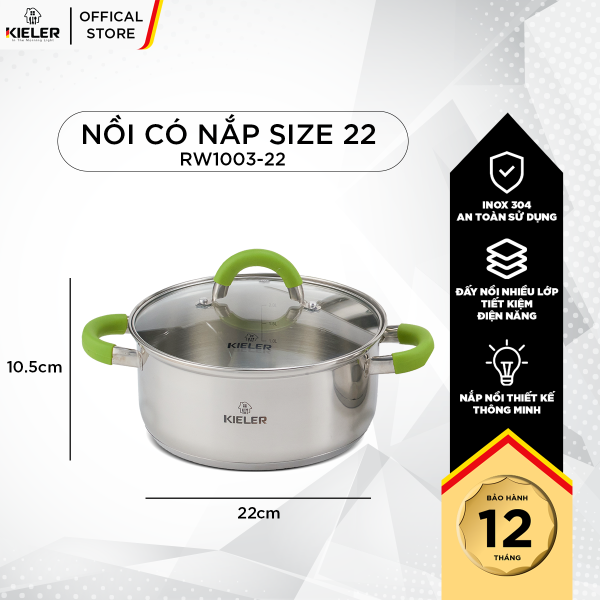• Tên sản phẩm: Nồi Inox 5 đáy KIELER đáy từ 22cm nấu nhanh, tiết kiệm điện, có 2 lớp chống dính Whitford ít bám dầu mỡ RW1003-22