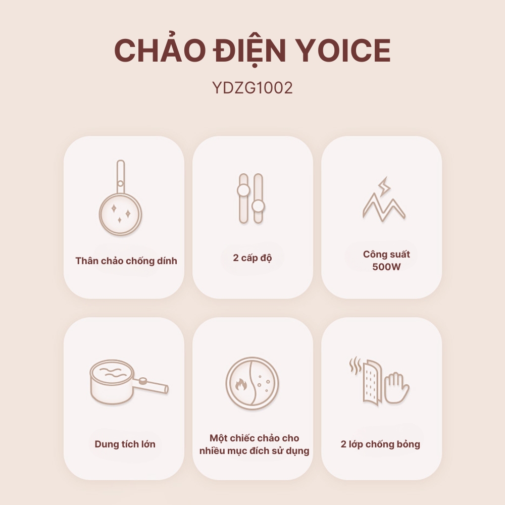 - Nồi điện YOICE đa năng công suất 500W tích hợp bảo vệ nhiệt, an toàn cho người sử dụng.