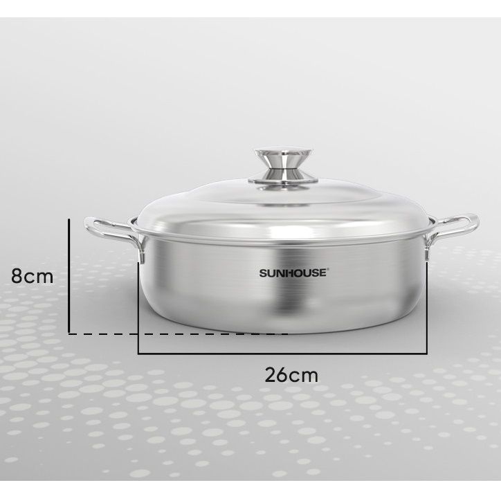 Nồi lẩu inox 1 đáy SUNHOUSE SHG26L có thiết kế vung nồi và tay cầm cũng bằng chất liệu Inox cao cấp chắc chắn và chịu nhiệt tốt, thuận tiện và an toàn trong quá trình sử dụng.